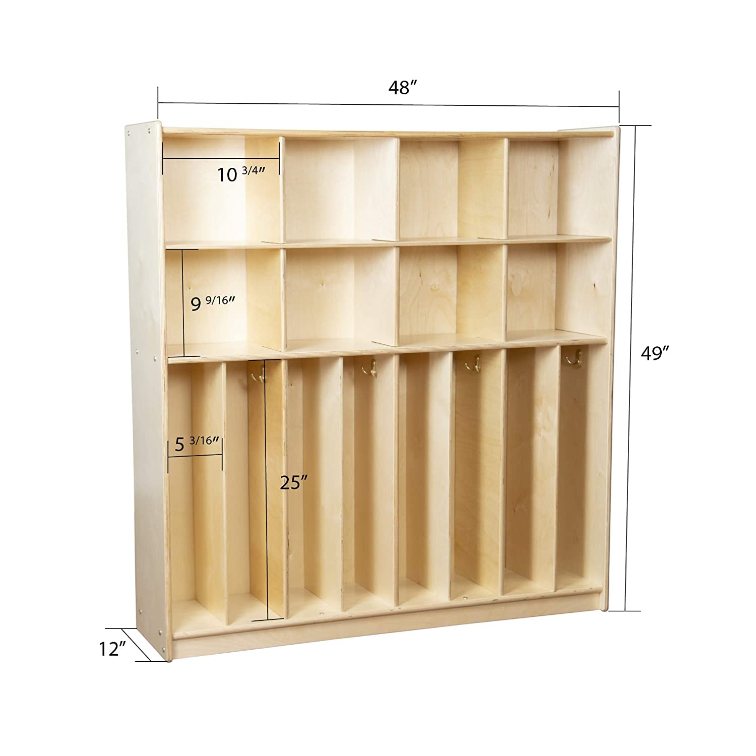 GREENGUARD® Gold certified. Locker features eight divided hanging sections to meet stringent sanitation requirements. Side mounted coat hooks in each section accommodates coats and additional items. Eight generous cubby compartments above for school materials, boots, & more. All surfaces and back are 100% Healthy Kids™ Plywood with our exclusive Tuff-Gloss™ UV finish. Fully assembled.