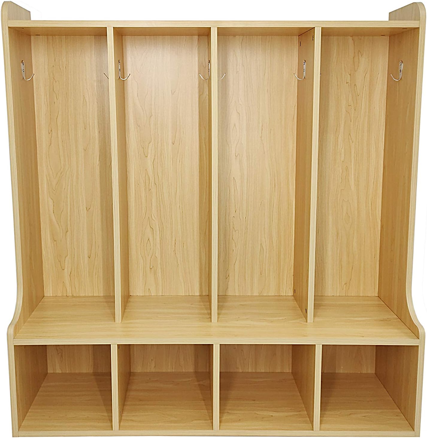 The 8 Hook 4-Section Locker serves as a perfect storage solution for kids at home or in preschools, ensuring organized storage of backpacks, coats, shoes, and lunches with a solid, stable construction. Featuring a long extended cubbie section and a longer lip for convenient seating while putting on or removing shoes, this mudroom unit offers enhanced stability and functionality. Its deep cubbie design provides ample storage space in each cubby hole, offering more room for various items to be stored neatly and efficiently. Constructed from durable 3/4" thick MDF Engineered Wood with a Maple Melamine finish, this 60 lbs locker ensures super sturdy construction, providing reliability and longevity. Measuring 41" L × 13" W × 42.5" H with a coat hanger section of 29.5" tall, the hanging hooks are adjustable to accommodate longer coats, allowing customization based on kids' age groups, while maintenance involves simple cleaning with a damp cloth or sponge, followed by drying.