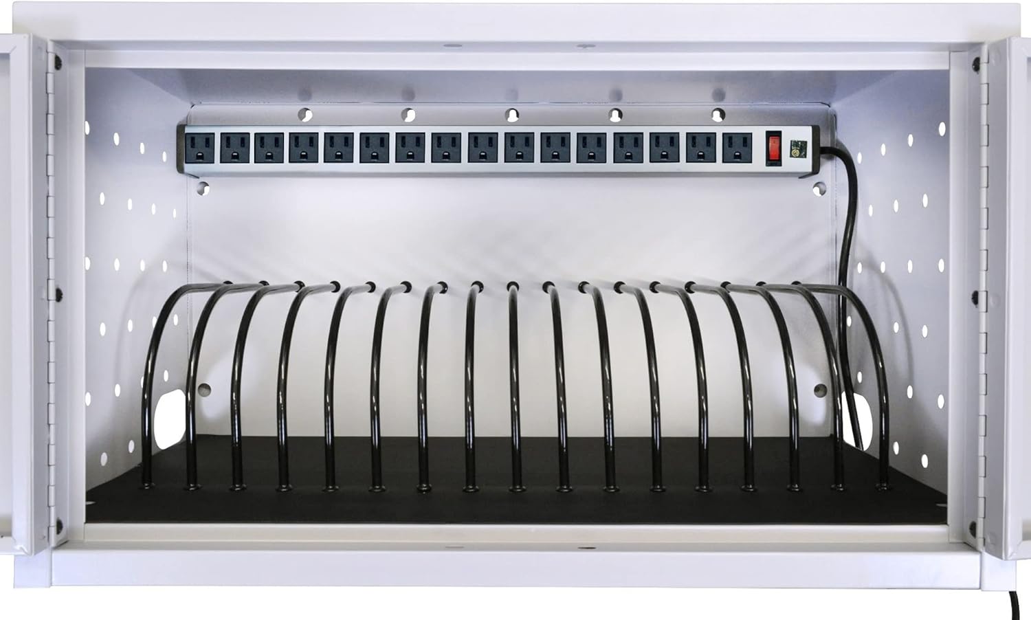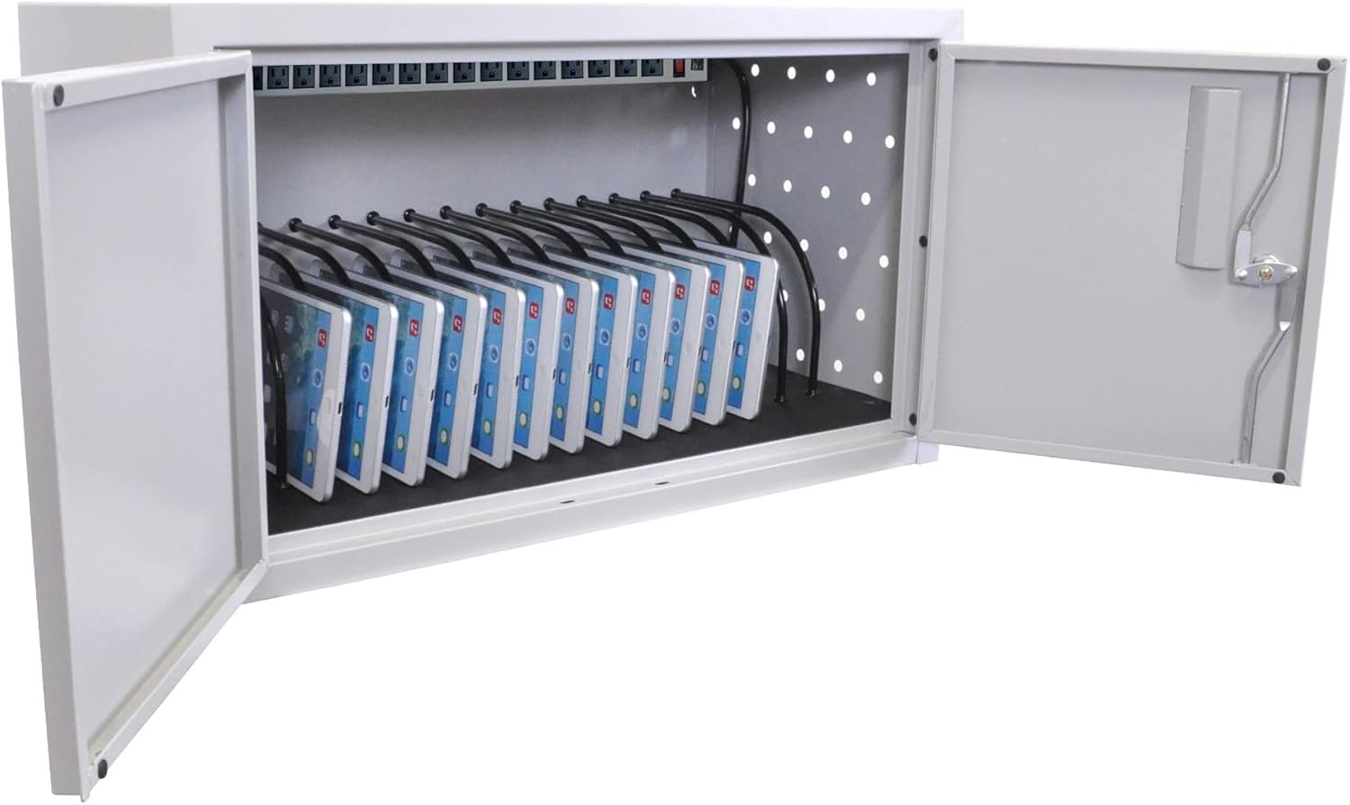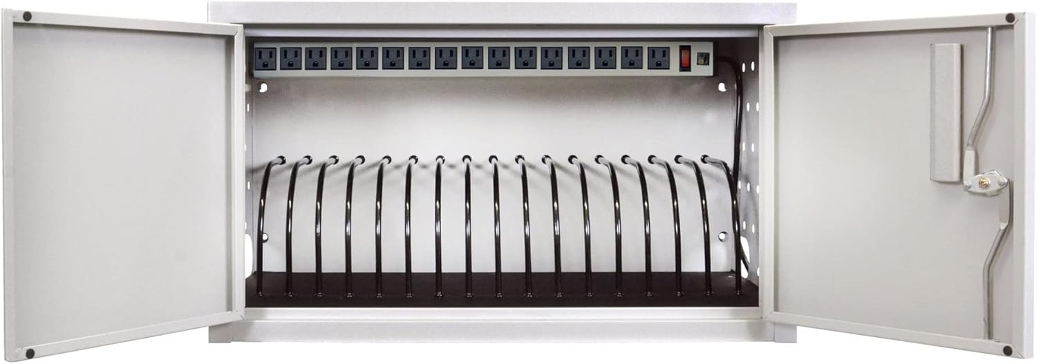 Do away with cord clutter while safely ensuring devices are always charged and ready for use. Perfect for small offices, classrooms and libraries, Luxor Wall / Desk Tablet Charging Cabinets provide a strong, simple design that's reliably secure yet affordably priced. A steel shell with lockable door coupled with a padded interior and rubber-coated dividers protect your devices, and the compact size makes Luxor Tablet Charging Cabinets great for wall mount or desktop use. *Special Note:* Due to the latest, larger size of the 20W Apple iPad and Samsung Chromebook USB-C charging block adapters, only half of the available plug outlets are accessible in this unit.