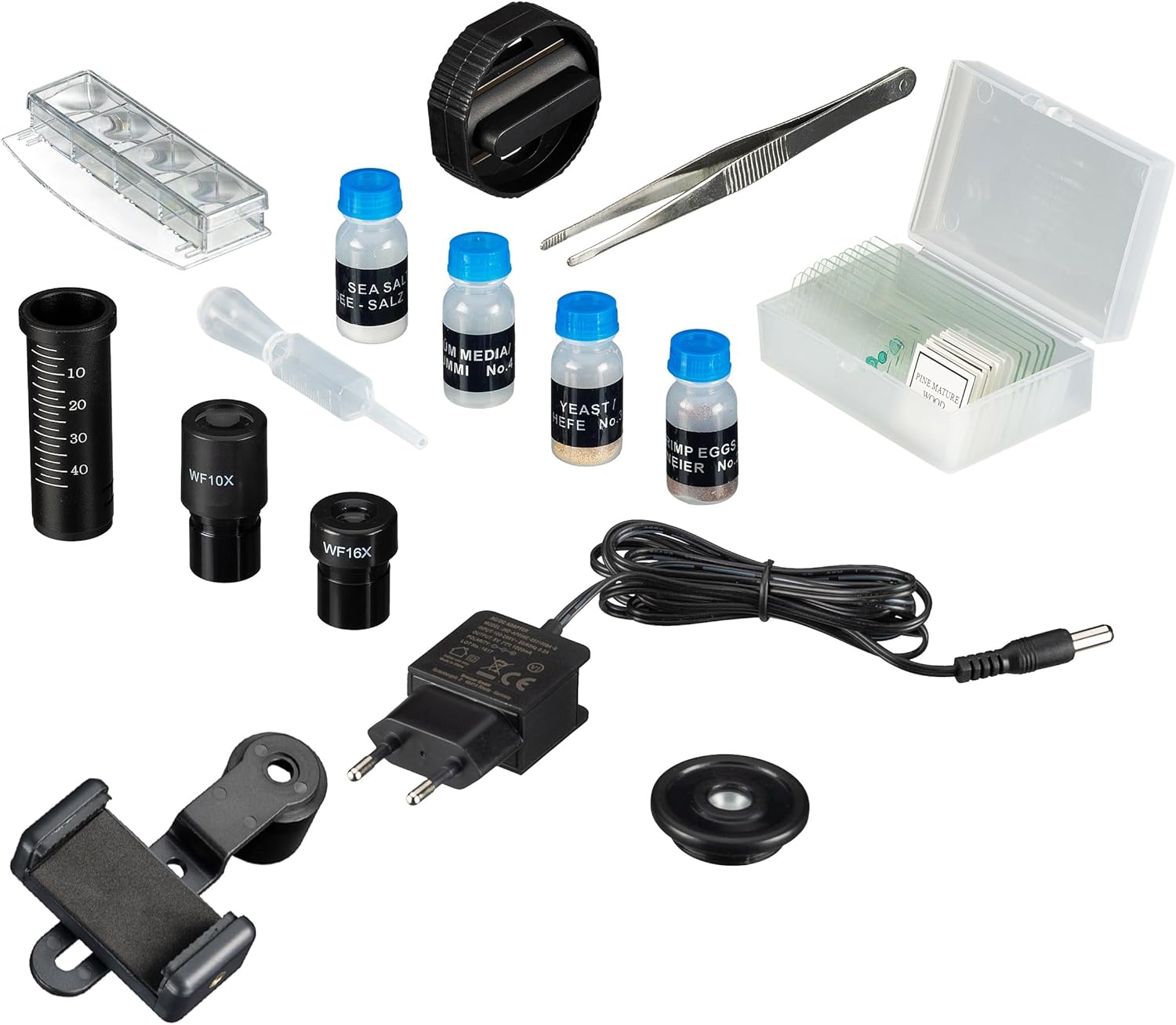 BRESSER Junior - play to experience the world of optics. More than a classic microscope. This microscope set from Bresser is robust and flexible to use. Don't just give children a toy that will soon be in the corner. With this microscope set, which allows an immediate start into the world of microcosm with a rich accessory package, you give children much more than just a toy: they encourage children's scientific work while stimulating the urge to explore. When asked what certain things actually consist of, children can now explore for themselves how the world of the microcosm is structured with this microscope. Take photos with your smartphone through your microscope. With the smartphone adapter, this is now child's play. Attach your smartphone to the nubs of the holder and then use it all together as a telephoto lens for your smartphone camera. This makes it easy to photograph the object under your microscope.
