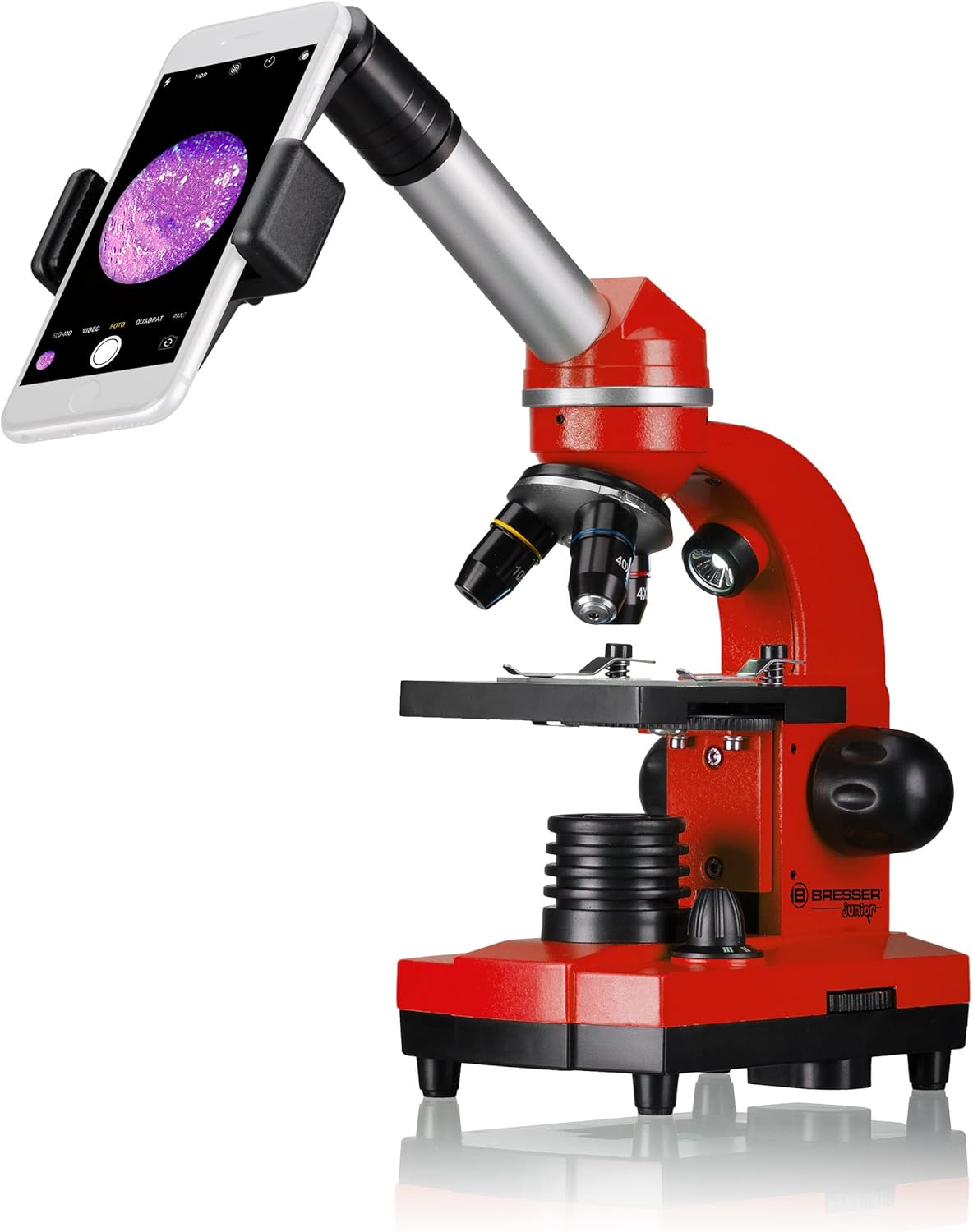 The Bresser Junior student microscope offers an optimal introduction to microscopy with its rich accessories. Unique in these models is the Barlow zoom system in the eyepiece socket: thanks to a pull-out additional lens, the magnification can be continuously changed up to 2x during visual observation, so that magnifications of 40x to 1600x can be achieved together with 3 lenses and 2 interchangeable wide-field eyepieces. The Bresser Junior student microscope has an adjustable LED for transmitted light and incident light including filter disc with colour filters and apertures. So the lighting can always be optimally adjusted. Thanks to the additional incident light illumination, objects that are not transparent can also be microscoped, such as leaves, small insects and much more. This makes it particularly easy to get started with microscopy. The power supply is via batteries (three pieces type AA), so that even without a socket nearby can be microscoped. The accessories already contain permanent preparations and 5 empty slides and cover glasses for making your own preparations. In addition, a preparation cutlery, consisting of a MicroCut, a knife, tweezers, a rod and a tube is included in the set. The smartphone adapter allows you to save the recordings on your smartphone or share them with friends and family! There is so much exciting to discover in the microcosm, start now with your Bresser student microscope. Available in the following colours: red, green, blue, purple.