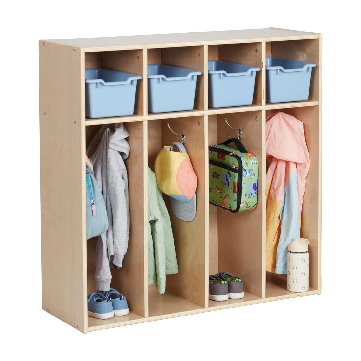 Maximize space and keep your room organized and clutter-free with the ECR4Kids Streamline 4-Section Toddler Coat Locker. The wooden locker features four long compartments with eight double coat hangers for sweaters, toddler backpacks, and umbrellas. Give children their separate cubby storage to keep art projects, homework, and personal belongings organized. Pair with ECR4Kids Scoop Front Storage Bins to keep little things contained and off the floor; bins are sold separately. Use in a children’s bedroom to organize dress-up clothes, costumes, accessories, hats, gloves, and more. The low-profile open-face shelves encourage children to care for their belongings and clean up independently. The drop-and-go storage is constructed from sustainably harvested birch plywood with a durable finish sealing the wood surface and resisting scratching. A UV inhibitor helps furniture resist ultraviolet light and yellowing. Natural birch plywood is extremely durable and will hold up to everyday use in daycare, and preschool, and is perfect for the home. Combine the Montessori storage with other ECR4Kids Birch Collection furniture pieces to complete the space.