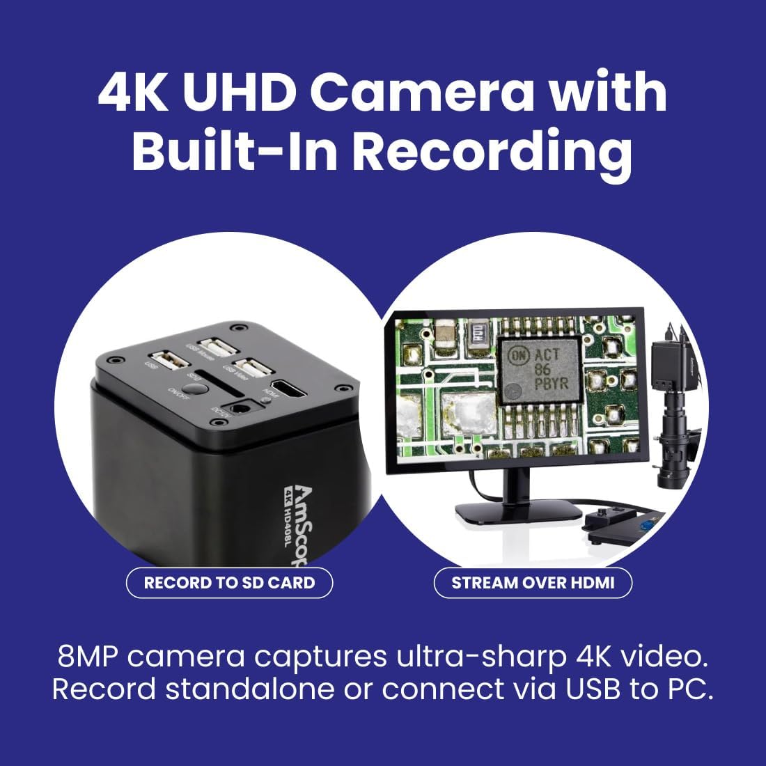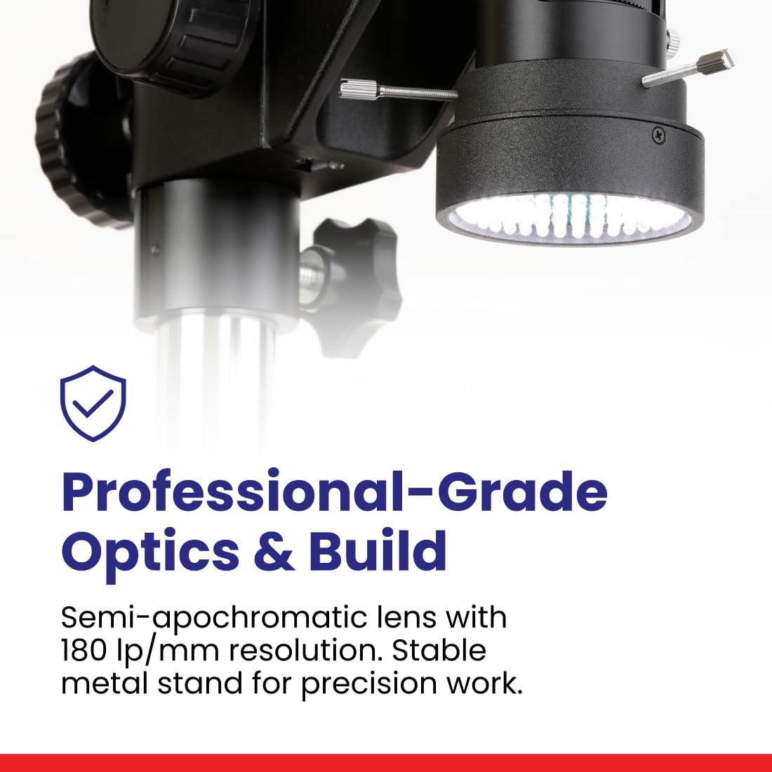 The H800 is designed specifically for photomicrography, providing 0.7X-5X zoom magnification and a C-mount interface for most professional microscope cameras. While stereo microscopes are the preferred choice for low-magnification work like micro-soldering and dissection, the stereo lens design is not optimal for producing accurate photos or videos due to off-axis, angular distortion and keystoning. This single-lens microscope provides the same magnification range, but without the distortion.