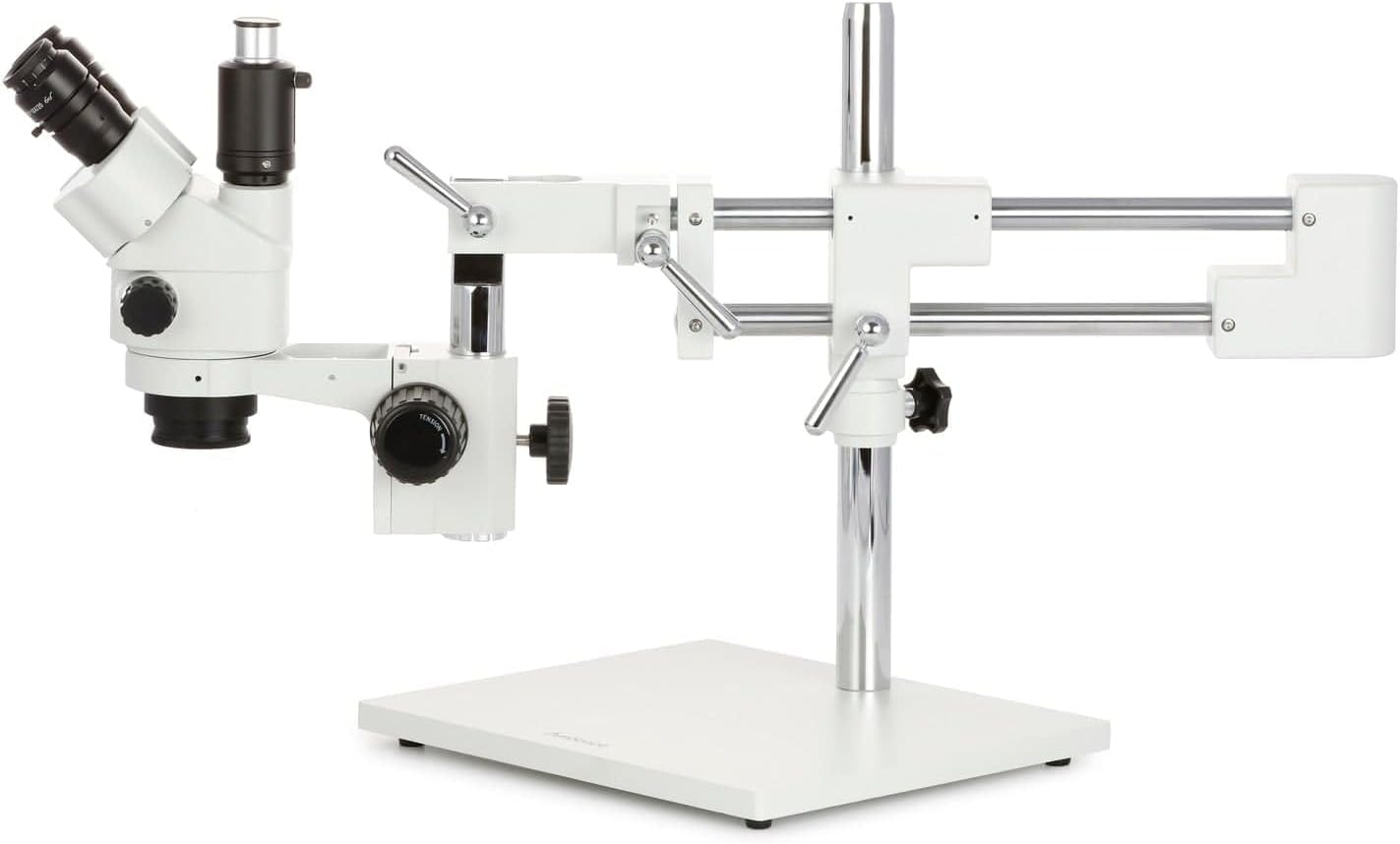 The SM-4NTP is a heavy-duty, highly-flexible microscope designed for biological and industrial applications. This model is especially popular in the QC, repair and engraving industries thanks to its ease-of-use and reliability. This model features a zoom-lock to maintain consistent magnification when needed, and uses focusable eyepieces rather than integrated dioptric adjusters. With its wide zoom range and double-arm boom-stand, this model will become an indispensable instrument in any workshop or lab. The trinocular photo-port is simul-focal, so it can be used simultaneously with both eyepieces.OpticsThe stereo optics provide clear, sharp images with excellent focus-depth and a large working-distance. With 0.7X-4.5X zoom objectives, moving through the magnification range is as easy as turning a knob. A zoom-lock allows the objectives to be set to a consistent magnification when needed. 10X wide-field eyepieces provide an ample magnification range from 7X to 45X, with high-eyepoint optics to accommodate glasses or goggles.Ocular AdjustmentThe ocular tubes are not equipped with dioptric adjusters, so focus is more consistent. Focusable eyepieces are included to compensate for vision irregularities, and are available in various optional magnifications. Rotating interpupillary adjusters simplify the process of aligning the eyepieces for each user.Simul-focal Trinocular PortThe simul-focal optics in this microscope allow the trinocular port to be used simultaneously with both eyepieces. This means a camera can stream live images from the microscope while you continue to work with full stereoscopic vision. This is accomplished by sharing the left objective lens with the left ocular and the photo-port. This microscope uses our CX series trinocular port, so it can be easily replaced with optional C-mount ports to match specific cameras.Double-arm Boom-StandThe multi-pivoting, double-arm stand provides a stable, flexible support system, ideal for hands-on work. Use of a drop-down column allows the head to be positioned at virtually any angle. Ball-bearing provide smooth movement of the lateral arms, which can easily pivot the microscope out of the way when it is not needed. The heavy, steel base ensures the stability of the microscope, even when laden with attachments.This package includes a 144-LED ring-light for bright and cool illumination. This lightweight illuminator mounts to the microscope’s objective housing, and projects a smooth, encompassing field of light over objects, eliminating most shadows. For added convenience, a separate power-controller is used to manage the brightness. Whether used as the sole light-source or in combination with additional illuminators, the ring-light produces a crucial light pattern for virtually any application. Energy-efficient and producing low heat, this ring-light can be used with biological specimens as well as industrial.Specifications Microscope Head Head Type Simul-focal trinocular, 45° incline, 360° rotatable Optical System Greenough stereoscopic Interpupillary Adjustment Compensation-free gemel, 54-75mm Ocular-port Diameter 30mm Dioptric Adjustment none (use focusable eyepieces) Eyepieces 10X Photo Port height-adjustable 23mm tube, CX series, simul-focal Objective Lenses 0.7X-4.5X lockable zoom Native Field-of-View 4.4mm-28.6mm Native Working Distance 100mm Auxiliary Lens Mount 48mm thread Auxiliary (Barlow) Lenses Included 48mm thread: none included Stand Stand Type Double-arm boom-stand with ball-bearing movement, cast-steel base Stand Dimensions 20" double-arm (overall length: 30"), 17" high pillar, 10-1/4"x8-1/4"x2" Focusing-block Focus Range 50mm Packing List:One trinocular stereo microscope headOne photo port attachmentOne pair 10X eyepiecesOne pair eye-guardsOne double-arm boom-stand with focusing rackOne LED ring-lightOne power controllerOne power cableOne ring-light mounting adapter