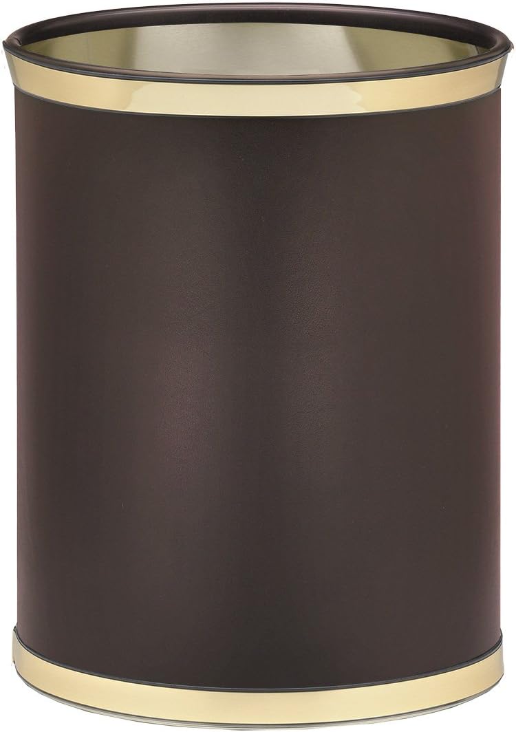 Kraftware's Classic Sophisticates Collection Oval Waste Basket in Black with Brass color bands sits atop bumpers to avoid any damaging bumps and tumbles. This piece boasts a 13-quart capacity and is beautifully topped with a high quality leatherette covering to enhance its construction. Made in the USA, this trash receptacle has a metal interior and built to withstand every day use. The Classic Sophisticates Collection also features a round waste basket, 3-quart ice buckets, 2-quart ice bucket, and serving tray. This waste basket measures 13.75” H x 7.75” L x 10” W and is sold individually.