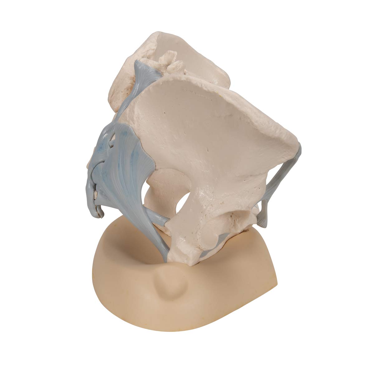 This life size three part model represents an original cast of a bony female pelvis with ligaments and shows all the details of the following anatomical structures: Two hip bones, the pubic symphysis, the sacrum and the coccyx, the fifth lumbar vertebra with intervertebral disc. A midsagital section through the fifth lumbar vertebra, sacrum and coccyx, allow both halves of the pelvis to be disassembled revealing a part of the cauda equina in the vertebral c . The left half of the fifth lumbar vertebra is removable. The right half of the model shows the following pelvic ligaments: inguinal ligament, sacrotuberous ligament, sacrospinous ligament, anterior sacroiliac ligaments, iliolumbar ligament, anterior longitudinal ligament, interosseous sacroiliac ligament, posterior sacroiliac ligament, obturator membrane. This anatomically detailed model is a great way to teach and learn the anatomy of the human female pelvis. NEW and exclusively with original 3B Scientific anatomy models - now enhanced with 3B Smart Anatomy. Your advantages with all 3B Smart Anatomy models: Free warranty extension from 3 to 5 years, free access to 3B Smart Anatomy courses in the award-winning Complete Anatomy app, this includes 11 3B Smart Anatomy courses with 23 lectures and 117 different views of interactive virtual models, plus 39 quizzes. To unlock these benefits, simply scan the label and register your 3B Smart Anatomy model online. All 3B Smart Anatomy features are completely free of charge. "Virtual meets Reality" developed by 3B Scientific makes learning human anatomy even more effective across all media.
