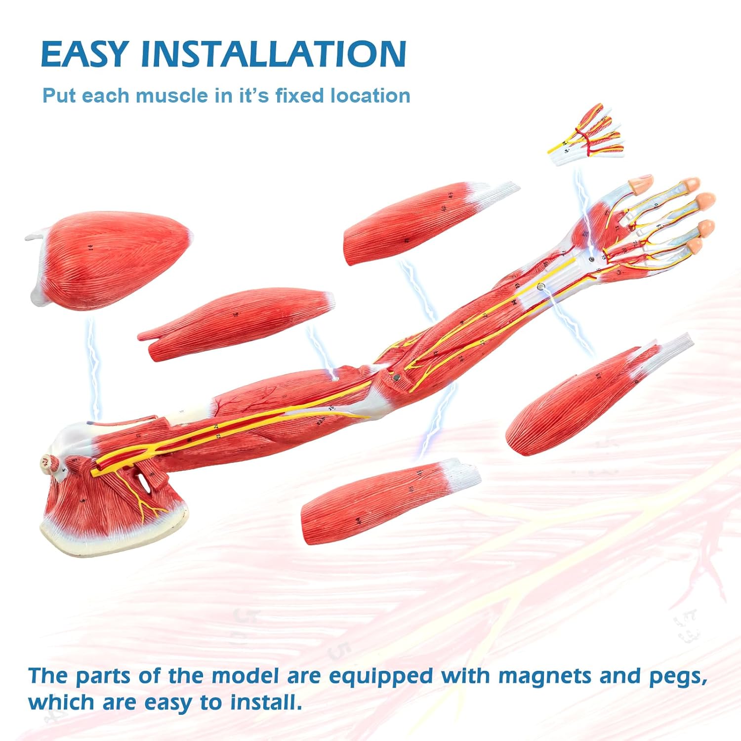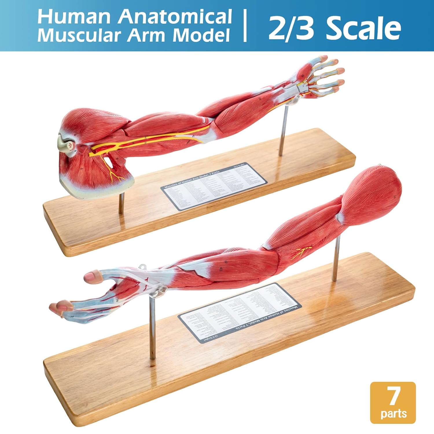 Merinden 2/3 Life-Size Human Arm Muscle Anatomy Model - 7-Piece Detachable with Numbered Labels & Educational Poster for Medical Education & Anatomy Study Explore arm muscular anatomy in detail with our 2/3 Life-Size Human Arm Muscle Anatomy Model—a 7-piece detachable tool designed for medical students, anatomy enthusiasts, and biology educators. At 2/3 human size, this model balances portability and precision: it displays realistic muscle fibers, tendons, and underlying structures, then splits into 7 numbered components for targeted study of individual muscle groups (like the biceps, triceps, and forearm muscles). The numbered labeling simplifies identification, making it accessible for beginners and detailed enough for advanced learners. The included educational poster cross-references the numbered parts with muscle names and functions, turning independent study or classroom lessons into a structured, engaging experience. The sturdy wooden base with support stands keeps the arm upright for convenient display during group demonstrations or personal review. Durably constructed to withstand repeated assembly and disassembly, this model is a reliable resource for mastering arm muscle anatomy—bridging theoretical knowledge with hands-on, visual learning.