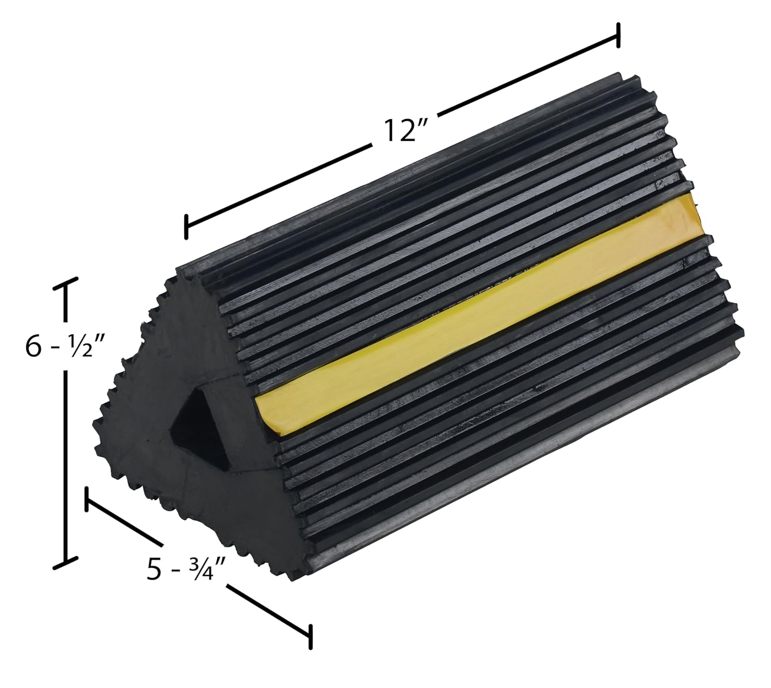 This Vestil EX-13 rubber wheel chock can be used for preventing accidental movement of trucks, trailers, and other wheeled vehicles. The chock is made of extruded rubber for resistance to slipping, tearing, ozone, abrasion, and adverse weather conditions. It has a ribbed surface to prevent slipping on the tire, and a reflector slip for visibility. The chock measures 6-1/2 x 12 x 5-3/4 inches (L x W x H). (L is length, the horizontal distance from front to back; W is width, the horizontal distance from left to right; H is height, the vertical distance from bottom to top.) This rubber wheel chock is suitable for preventing accidental movement of trucks, trailers, and other wheeled vehicles where exposure to changing weather conditions is expected.Vestil manufactures materials handling equipment, including hoists and trolleys, jib and gantry cranes, loading dock equipment, and storage solutions. The company, founded in 1968, is headquartered in Angola, IN.