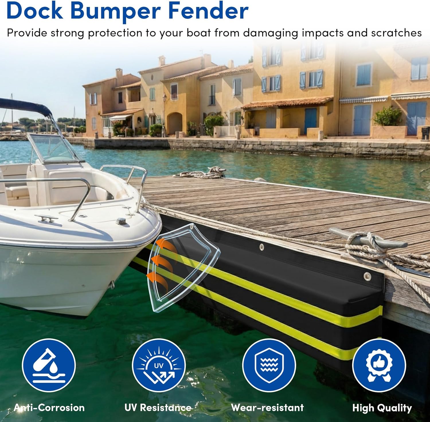 • Marine Dock Bumpers: The dock bumpers is made of high-quality anti UV and anti tear thick 500D PVC three-layer composite, with corrosion-resistant 316 stainless steel gaskets for double heat bonding at the joints, resistant to UV and saltwater, will not fade in sunlight, and can withstand harsh marine environments, providing long-lasting protection for your dock