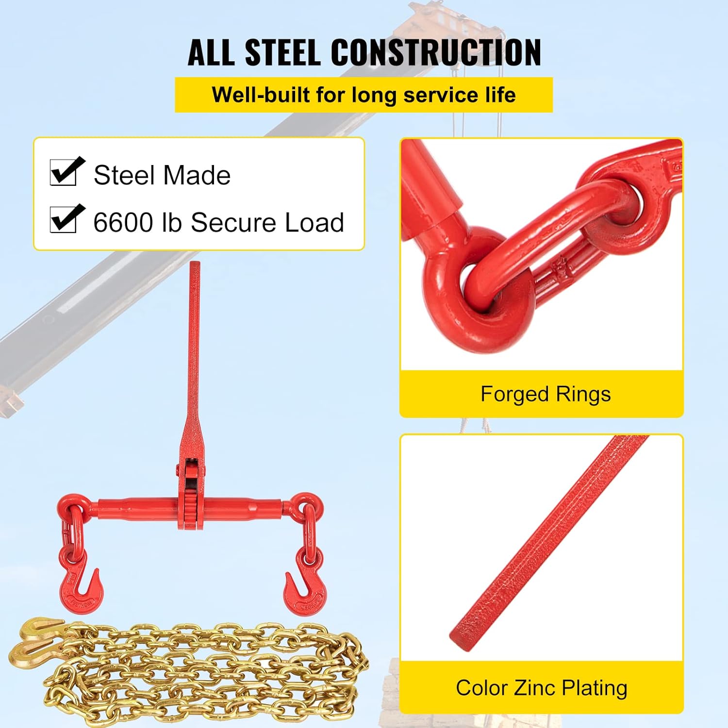 This bundle includes 4 heavy-duty chain load binders with 6,600 lb working load capacity and 10 premium polyester tie-down straps with 18,000 lb break strength to securely fasten your cargo for transport or storage. The robust steel chain binders feature smooth ratcheting mechanisms to easily tighten 5/16" G80 chains, providing a total lifting capacity of 26,400 lbs. Their 360° swiveling forged grab hooks securely engage the chains. With all-steel construction and a powder coated finish, these binders withstand heavy use. Complementing the binders are 30 ft long, 4 in wide yellow tie-down straps made of durable waterproof polyester webbing with a coated surface. Their 18,700 lb break strength and 6,000 lb working load limit tightly fasten items to truck beds and trailers. One end has a flat steel hook to conveniently loop into stake pockets. Together these components form a heavy-duty customizable system to securely bind diverse loads like lumber, plywood, pipes, vehicles, and equipment to trucks, flatbeds, and trailers for stable long distance hauling or short transit.