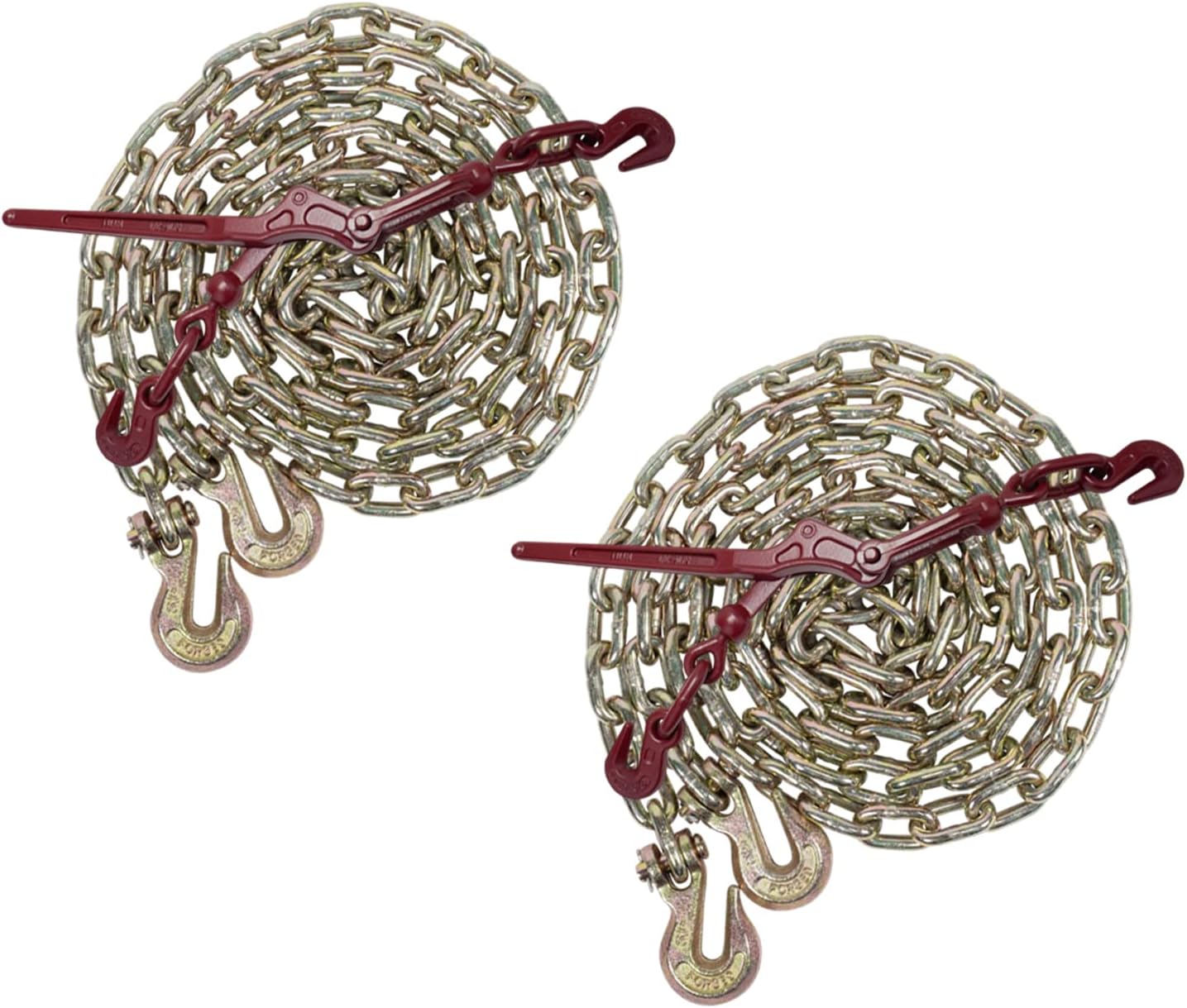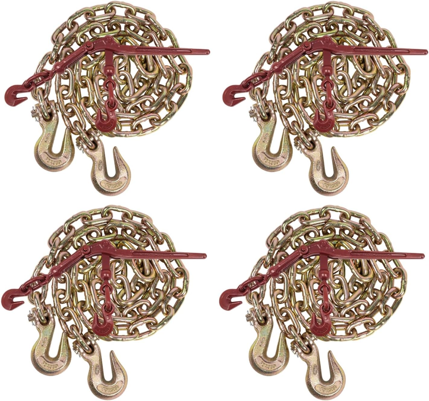 Pack Contains:(4) 3/8" x 20' Grade 70 transport Chain(CH3820)Grade 70 transportation chain with grab hooks on each end.Working Load Limit: 6,600 lbs.Capacity:26,400 lbsNote: The product is manufactured to meet the guidelines of NACM Standards.Also called tow and binder chain, binding chain, boomer chain, load chain, and coil chain.(4) 3/8" - 1/2" Chain Binder Lever Style(CBLS38)Working Load Limit:9,200 LbsCapacity: 28,000 LbsThese binders are also known as Snap BindersHeavy Duty Transport SecurementManufactured with heavy duty forged steelClearly stamped with Working Load Limit and CapacityMeets FMCSA and DOT CompliantNote:The product is manufactured to meet the guidelines of NACM Standards.