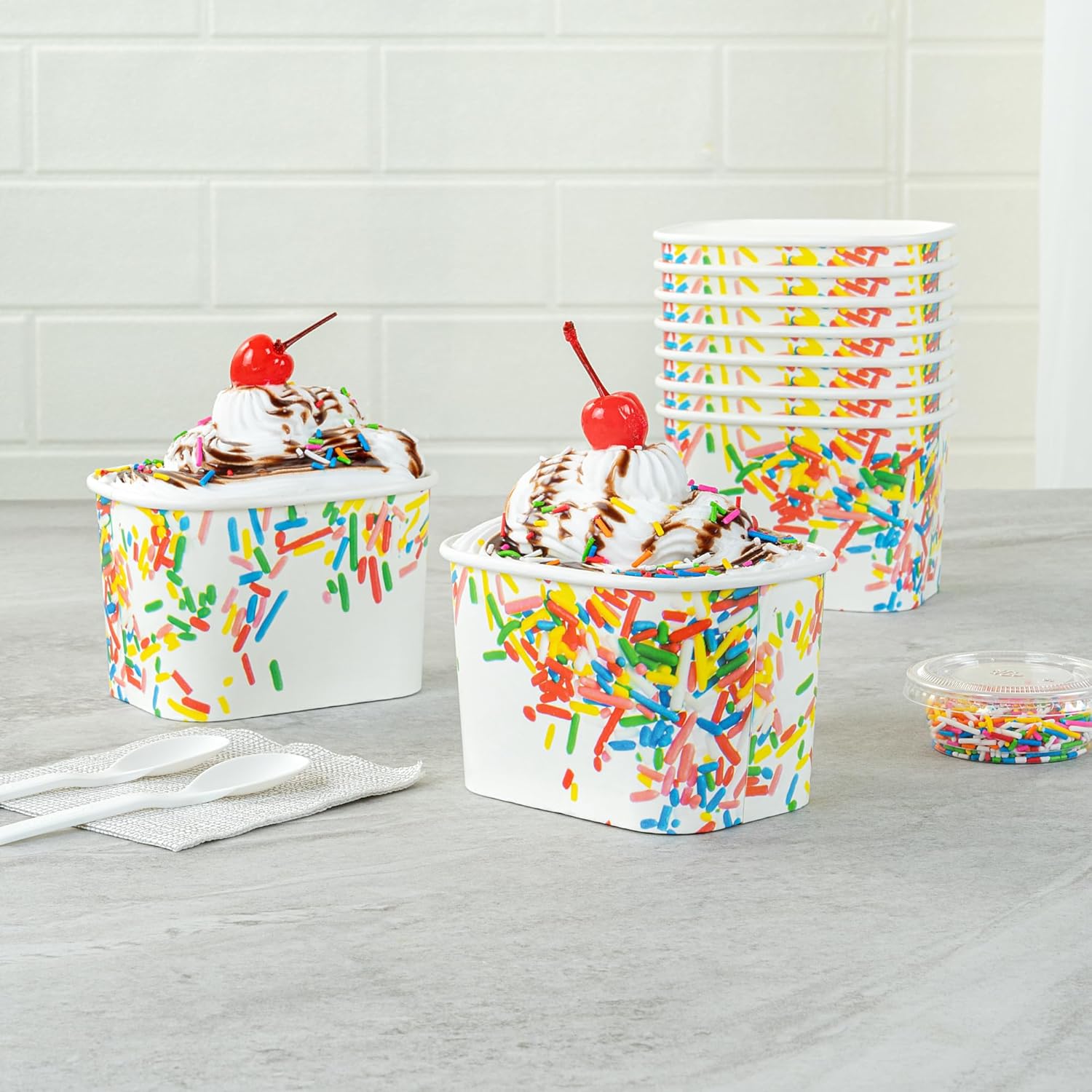Enhance your dessert presentation with leak-resistant convenience. The Coppetta Leak-Resistant Ice Cream Cup combines a double coated design with a waterproof coating to ensure liquids stay contained, making it the perfect disposable ice cream cup for busy parlors and cafes. Its 12-ounce capacity is ideal for serving generous portions of ice cream, frozen yogurt, or hot foods like soups and pasta, showcasing its versatility as a hot food friendly container. The classic sprinkles pattern adds a playful touch to any frozen yogurt cup, appealing to customers and elevating your dessert offerings. With the freezer-safe feature, you can confidently store ice cream and frozen desserts without compromising quality. Made from durable paper, this square dessert cup measures 4.21 inches in length and maintains its shape. Each order includes 200 Coppetta Leak-Resistant Ice Cream Cup.