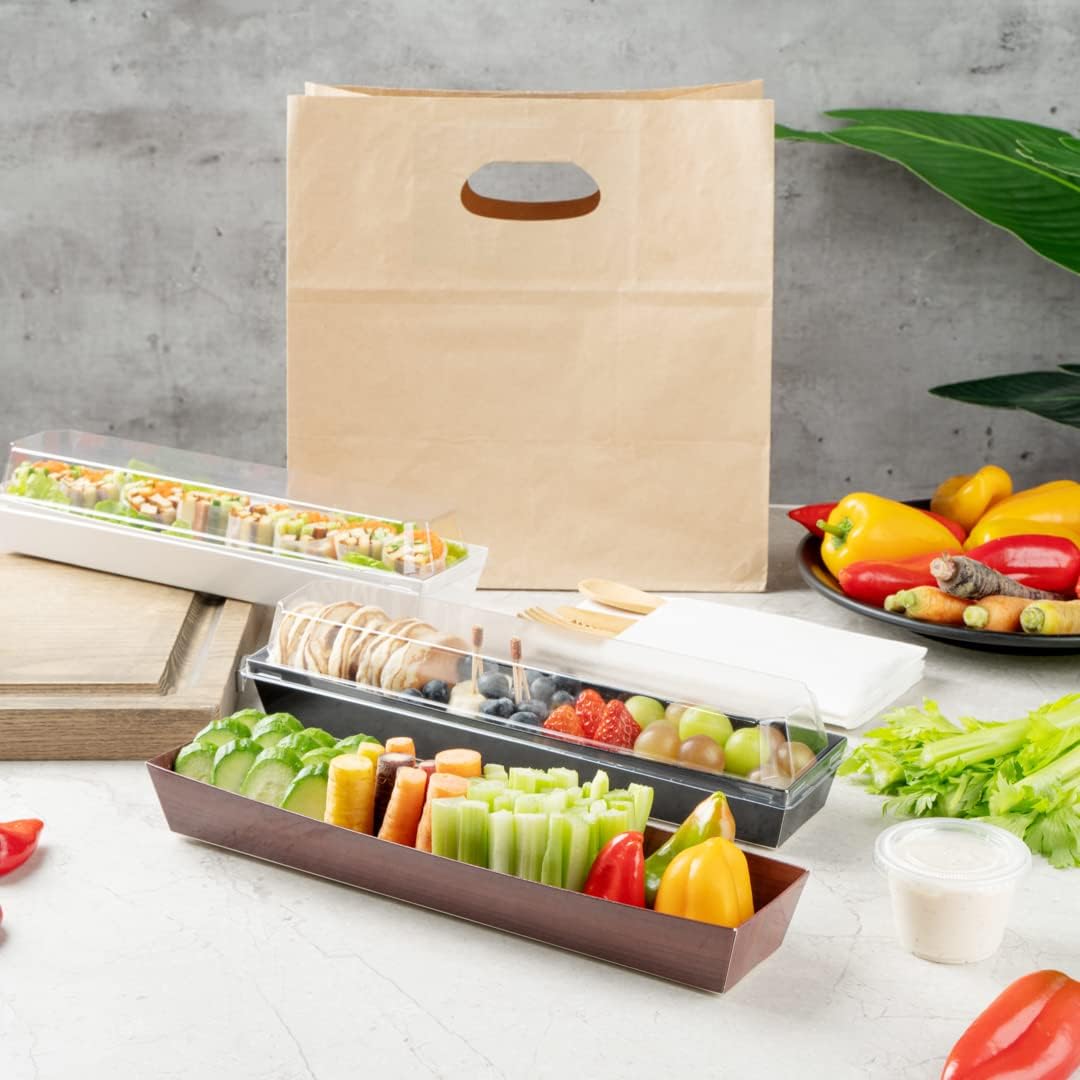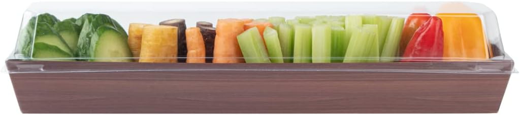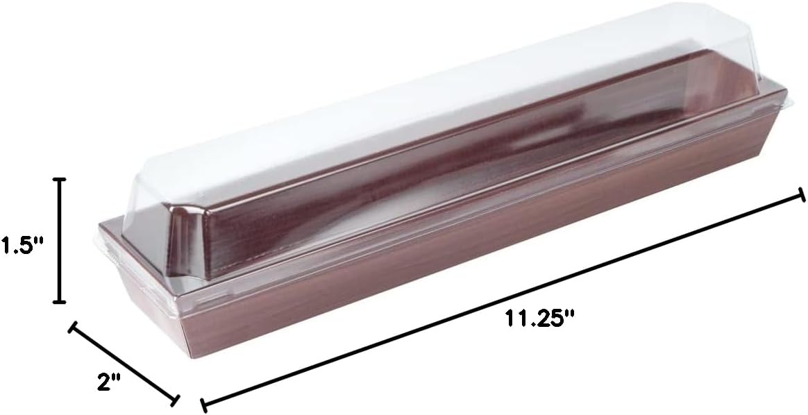 Give customers a unique dining experience with our Matsuri Vision Wood Grain Paper Large Maki Sushi Containers. These sushi containers are equipped with a greaseproof PE lining to avoid oils or sauces from leaking through. Coordinate these to go containers with our compatible Matsuri Vision lids to securely seal meals during transport (SKU: RWA0475C). Designed with a wood grain finish, these to go sushi boxes allow for elegant food packaging orders. Constructed from premium paper, these wood grain sushi containers are durable to easily carry hefty meals. To save space in your storage area, these paper sushi boxes are stackable. These take out sushi containers are reprocessable for quick and easy cleanup. With a total measurement of 11.2 inches in length by 2 inches in width by 1.4 inches in height, these large sushi containers are perfect for various types of sushi rolls. Sold in a 100 count box. Lids are available and sold separately.
