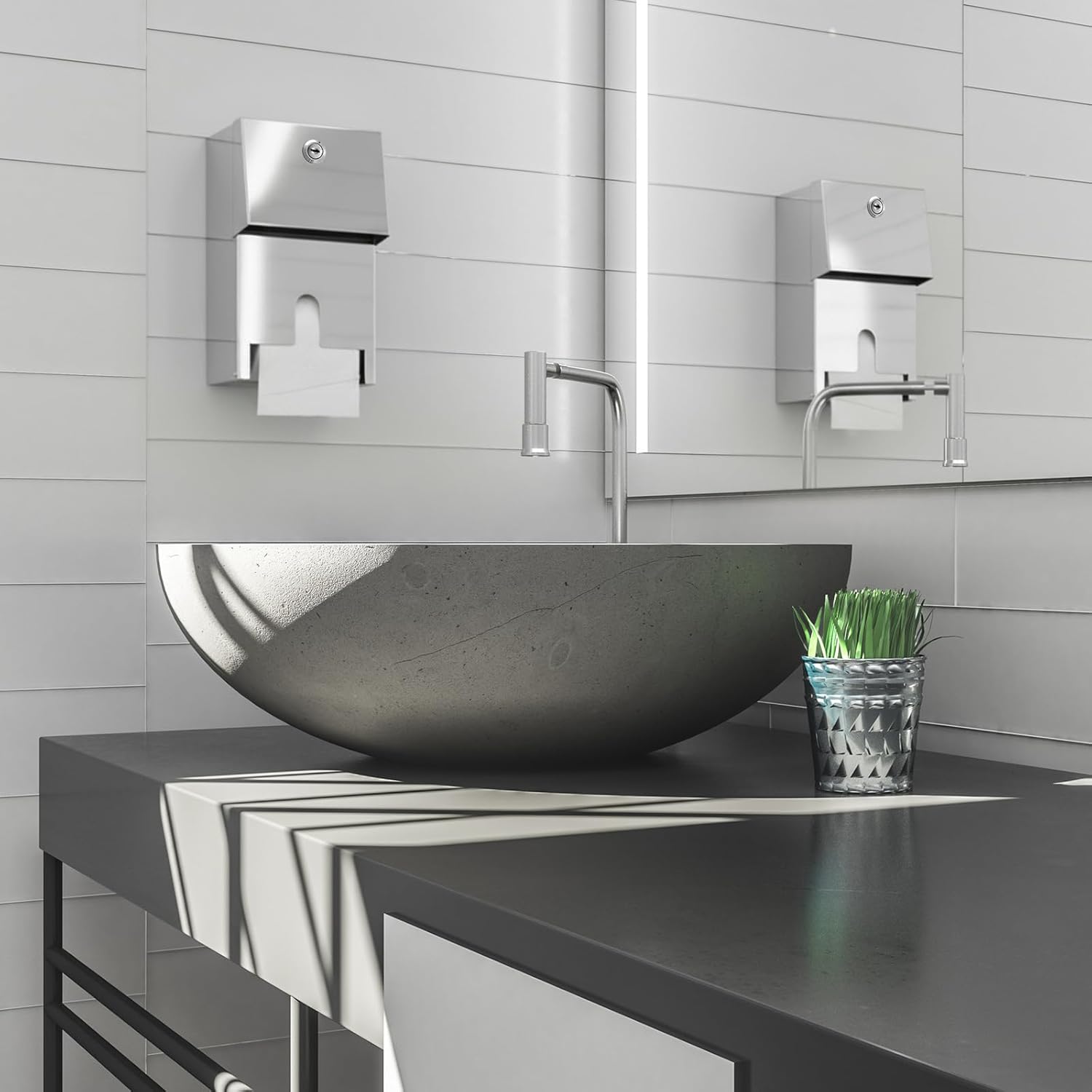 Features: Wide range of uses Scenarios: Suitable as bathroom paper tissue dispenser for offices, restaurants, and homes. The steel toilet paper dispenser blends with modern decor while meeting commercial requirements. From corporate buildings to residential bathrooms, it delivers Functions suitable for various scenarios User Friendly Operation: The toilet paper tissue dispenser enables effortless paper loading with accessible roll chamber. Its wall mount stainless tissue dispenser design includes smooth rolling mechanism for consistent paper feed. No special tools required for routine maintenance or refills Specifications: Material: stainless steel Color: gray Size: 10 x 5.5 x 4.7 inches/ 25.4 x 14 x 11.9 cm Package includes: 2 x Stainless Steel Commercial Toilet Paper Dispenser with lock Notes: Manual measurement, please allow slight errors on size. The color may exist a slight difference due to different screen displays