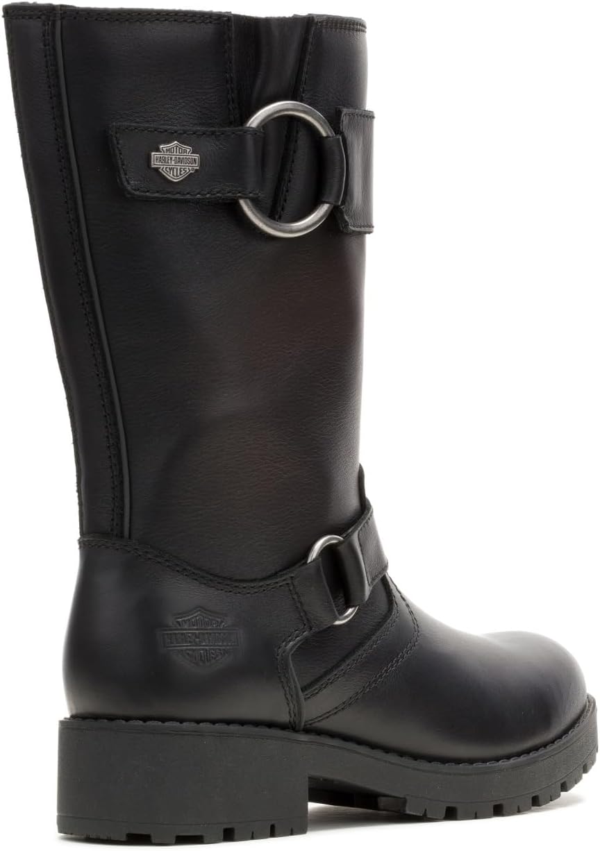Harley-Davidson Women's Kelley Ride Tall, Riding Appropriate* 10-Inch Waterproof Black Motorcycle Boots, D87314. Unleash the road warrior within with the Kelley Ride Tall Riding Boots. This taller version of the Kelley Ride series reaches a full 11.5-Inches off the ground. They are the epitome of style and protection. Made with waterproof full-grain leather, they are lined with Hydro-Guard’s waterproof membrane, which means your feet breathe, and stay dry as well. And, it doesn’t stop there. The upper leathers are heat resistant, there is D30 ankle protection, and there is also 3M reflective materials – which means you’ll be seen under low light conditions. The toe is rounded. Classic harness styling shows up with the front cross-strap which is attached to the harness styled O’Ring. Further up the shaft, a fashionable cross-strap and O’Ring attachment appears, along with a diminutive but classic metal Bar & Shield logo. The heel’s counter features a debossed Bar & Shield as well. Donning is easy with YKK locking inside zippers, making for a fast getaway. The boot's sole, insole and upper are bound using cement construction processes, a time honored and durable method that allows for a flexible and easy stride. Total height: 11.5", Shaft height: 10", Heel height: 1.5". Sizes US: M 5-10, 11. Manufacturer Part Number D87314. *Riding Appropriate – Abrasion, slip-resistant boots, ideal for riding motorcycles.