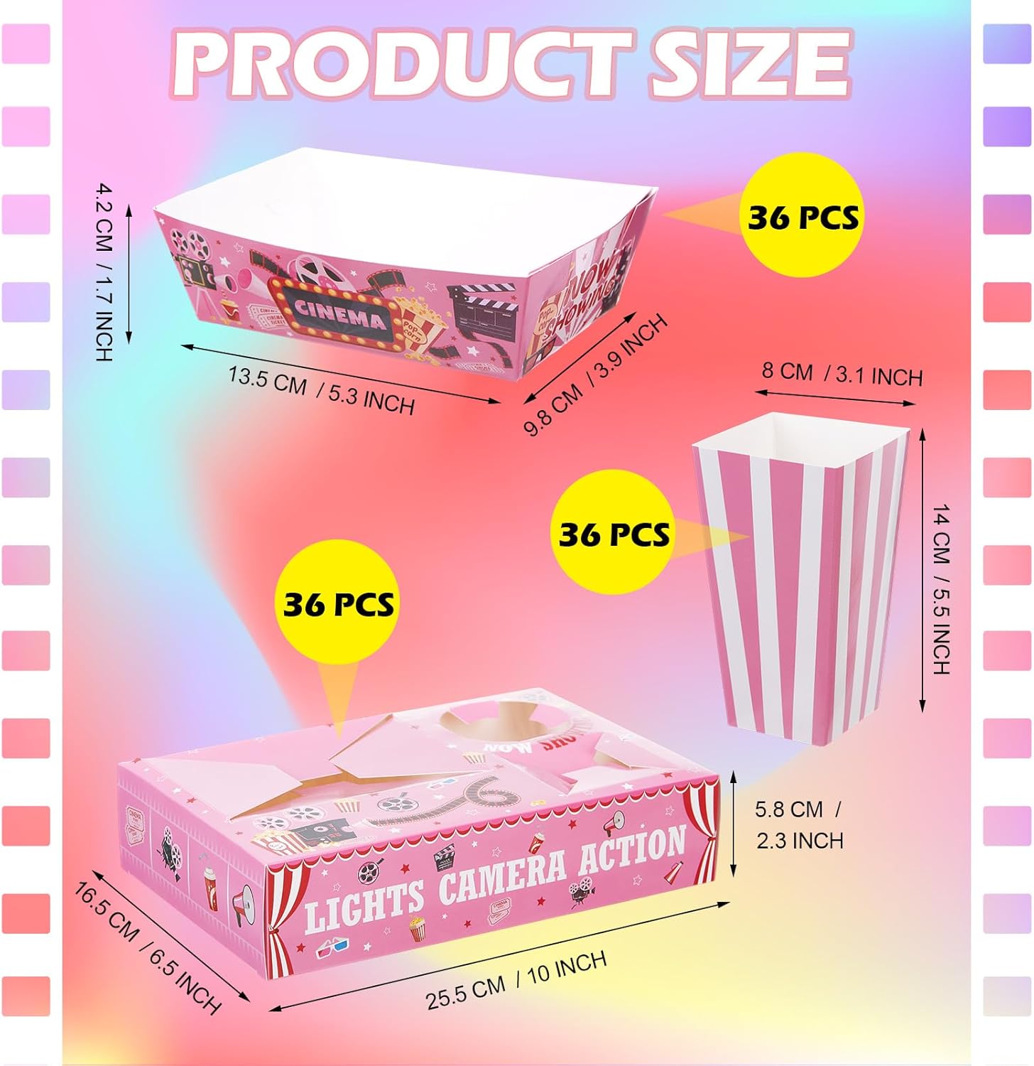 Features: With 36 sets included, our party supplies are ideal for larger gatherings, ensuring that every guest is catered for. The supplies feature classic movie themed designs, creating a festive atmosphere that enhances the overall party experience. Specifications: Main material: cardboard Main color: pink, white Package includes: 36 x Movie night combo trays 36 x Movie night snack trays 36 x Movie night popcorn boxes Notes: Manual measurement, please allow slight errors on size. The color may exist a slight difference due to different screen displays