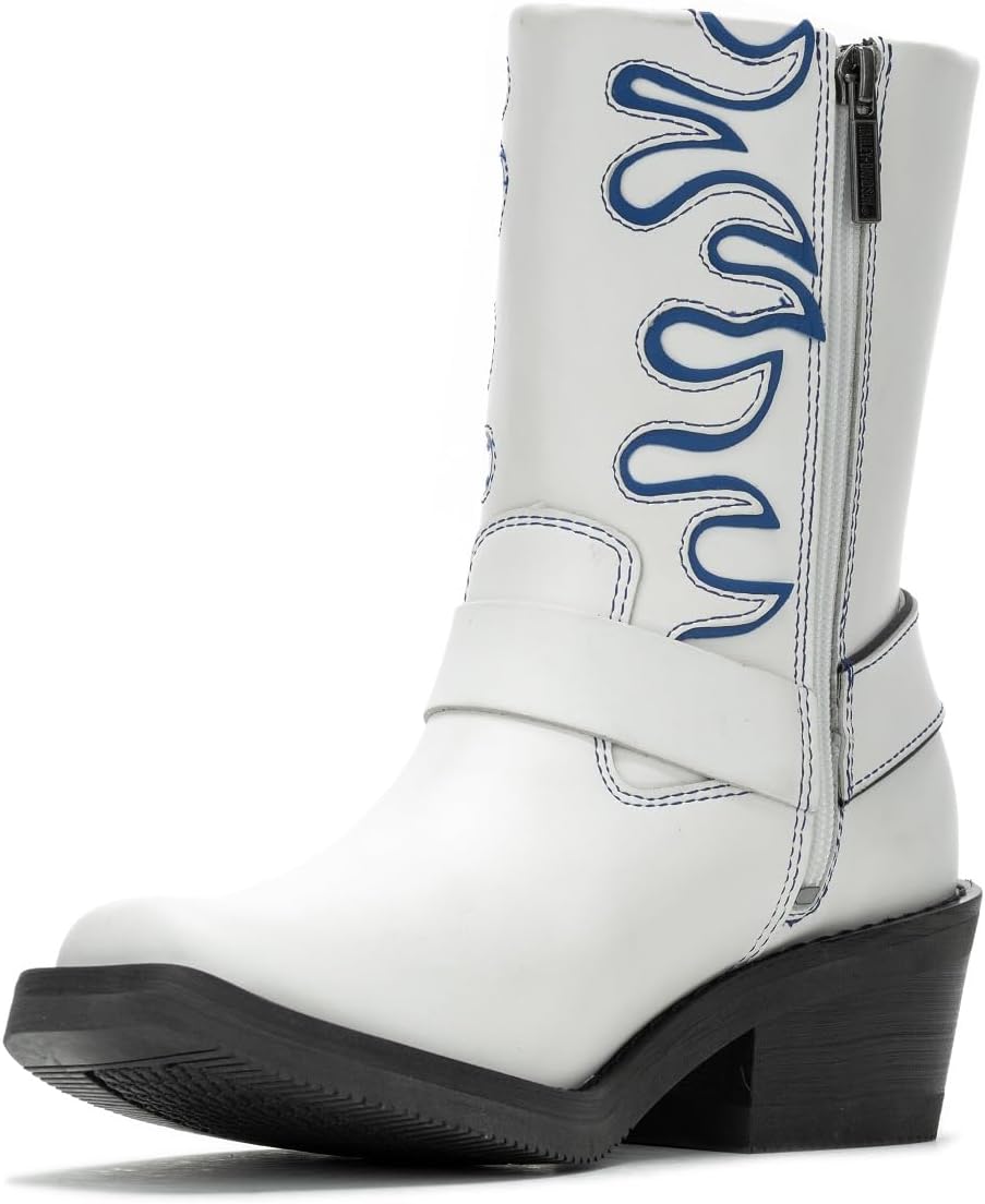 Harley-Davidson Riding Appropriate* Women's Korsen 8-Inch White Motorcycle Harness Boots, D87293. The popular Korsen Harness has been styled with a blue flame accent. A fun addition to your H-D wardrobe, featuring easy to clean full-grain leather, a full-length mesh lining, premium D30 ankle protection, reflective piping and a rubber outsole. This core style is versatile in both function, and style. Made with a western flair, this full-grain leather boot with its Harness detail is ideal on a motorcycle, as well as for everyday wear - at the office, for social functions, line dancing at the club, or for everyday wear around town. The D3O Fitted Ankle Guard offers increased protection and comfort with its ergonomic shape and tapered profile. Reflective piping provides increased visibility while riding low-light conditions. The YKK locking inside zipper offers the quick and secure fit that you crave. The toe is squared, invoking a western edginess. The classic O-Ring harness style is both versatile and functional, supporting both the fore and after straps. A debossed Bar & Shield logo in on the heel’s counter. A subtle Bar & Shield metal badge adorns the pull-on strap at the top of the shaft. The boot's sole, insole and upper are bound using cement construction processes, a time honored and durable method that allows for a flexible and easy stride. The western heel provides an ample 2.25-inch lift, and the rubber outsole means a soft landing with each step. A blue Bar & Shield logo is inserted into the street side instep. Pair with jeans, dresses or middies for a modern uptown look. Worn with jackets accented in blue is a show stopper. Total height: 8", Shaft height: 5.75-In, Heel height: 2.25". Sizes US: M 5-10, 11. Manufacturer Part Number, D87293. *Riding Appropriate – Abrasion, slip, and oil-resistant boots, ideal for riding motorcycles.