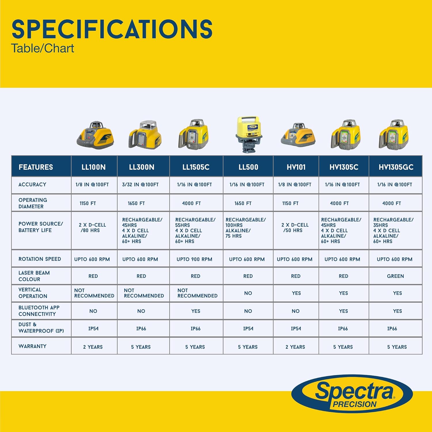 Product Description Medium-Range, Highly Accurate Leveling Solution The Spectra Precision Ll300N Laser Level Features A Rugged Design With A Metal Sunshade That Provides Superior Drop And Weather Protection (Ip66). Built To Withstand Severe Drops Of Up To 3 Ft (1 M) Directly Onto Concrete, Or Up To 5 Ft (1. 5 M) When Pushed Over On A Tripod Means Less Downtime And Cost Due To Damage Caused By Accidental Drop Or Tipover. . . And Lower Repair Costs Over The Life Of The Product. From the Manufacturer The Spectra Precision Laser LL300 is an automatic self-leveling laser level that is rugged enough to survive drops of up to 1 meter onto concrete and can be tipped on a tripod up to 1.5 meters and keep working. This strength, combined with full weather and dust proofing, results in reduced downtime and lower repair cost over the life of the product. Combined with the 10' Grade Rod(tenths) & 2161 Tripod and you've got the LL300-1 Kit.