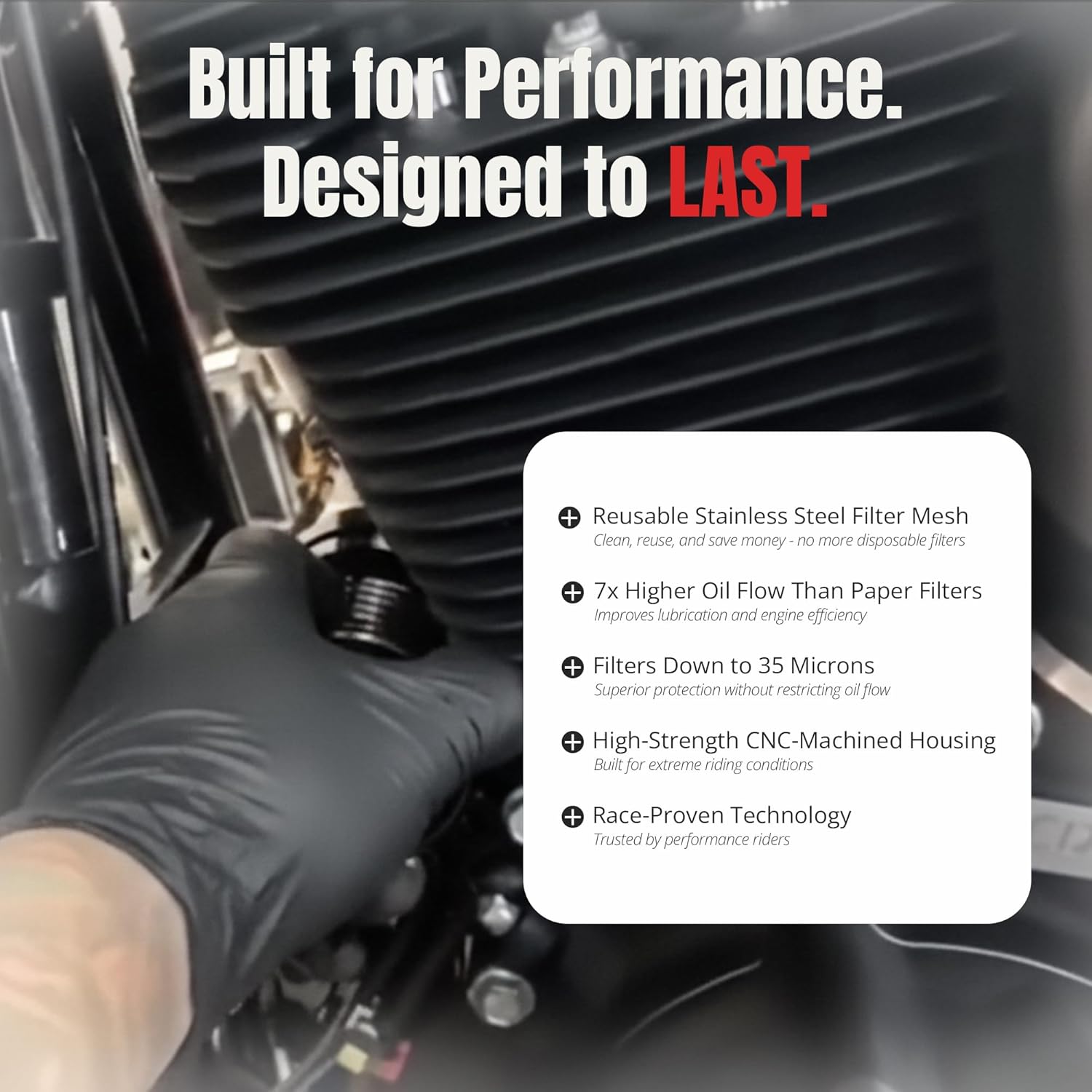 This should be the last oil filter you will ever buy made from laser cut, medical grade, 304 stainless steel micronic filter cloth, this filter provides 200 percent more filter area in many cases. Our stainless filter catches items down to 35 microns, which is about 3 times better than most good paper or brass filters. Unlike glued paper filters, the Flo Oil Filter pleat seam is welded and able to withstand up to 600 degrees. This filter maintains consistent flow under all conditions including extreme heat, the presence of water, and cold start ups where paper filters can flow so poorly that they often cause the bypass valve to open and allow unfiltered oil to enter your engine. This high tech filter technology is widely used in all types of auto racing including NASCAR, Indy type cars, Formula 1 and in the Aerospace industry where filtration is of the utmost importance. In addition to all the other benefits, our filter helps keep the land fills free of old used filters. Cleaning Instructions: Note the original filter position to ensure correct installation. Clean filter at each oil change with solvent, contact cleaner, kerosene, or any other degreasing agent; even common dish soap. Blow air through the filter from the inside out to remove any small particles or cleaning agent from the screen. Lube rubber parts with clean oil before installation. Fits: Harley Davidson Touring Twin Cam 99-13, Softail Twin Cam 00-13, Dyna Twin Cam 99-13, Touring Evo 82-98, Softail Evo 84-99, Dyna Evo 91-98, and Sportsters 85-13; Buell M2 Cyclone 97-02, S3 Thunderbolt 95-02, X1 Lightning 96-02; Aprilia Dorsoduro 750 09-12, Mana 850 08-11, Shiver 750 08-12; BMW F650 GS 08-13, F800 06-13, HP2 (without skid plate) 06-11, K100 83-93, K75 85-92, K1 89-93, K1100 90-93, K1200 99-08, S1000RR 09-13, R850 94-97, R1100 93-05, R1150 00-06, R1200 all 99-13, K1600 11-13; Moto Guzi 850 06-10, V11's (1100cc) 94-10, 940 07-10, 1200 06-12, MGS-01 Corsa 05-12, 1000 94-01.