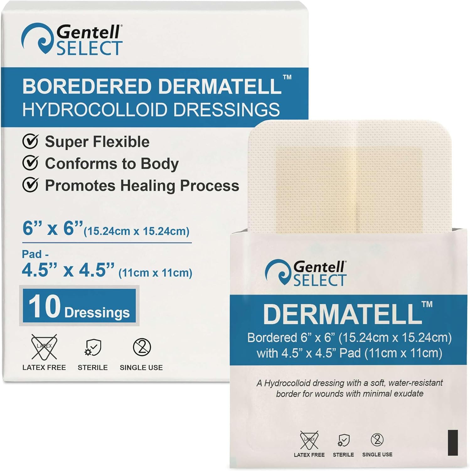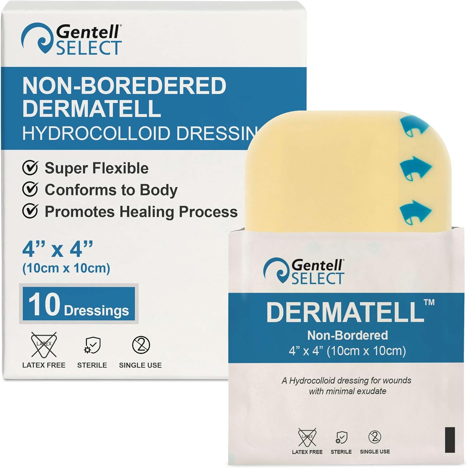 Gentell Select Dermatell Hydrocolloid Wound Dressings are designed with a soft, pliable wafer that enhances comfort while supporting optimal wound healing. These advanced dressings promote a moist healing environment by absorbing exudate and forming a protective gel over the wound site. Available in both bordered and non-bordered versions, they conform easily to the body and stay securely in place for up to three days.The bordered version features a water-resistant adhesive that allows for normal washing and bathing without compromising adhesion. A beveled edge design reduces the chances of dressing lift, improving durability and minimizing disruption. Choose from various sizes, including 4" x 4", 6" x 6", and 6" x 7" sacral, to meet a range of wound care needs.