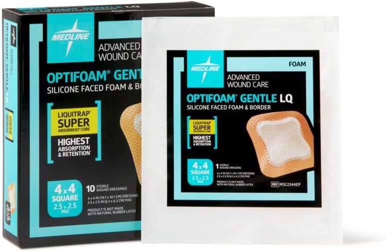Experience advanced wound care at home with our premium, medical-grade Optifoam Gentle Dressing. Designed to outperform standard drugstore bandages, this dressing features a unique 5-layer construction with a Liquitrap superabsorbent core. This core effectively absorbs wound drainage, converts it into a gel, and securely locks it away from the wound, promoting a cleaner and healthier healing environment. The silicone-faced foam gently covers the wound, reducing friction and enhancing comfort. The silicone border provides gentle adhesion, allowing the dressing to be lifted and reapplied for wound checks without losing its stickiness. Its low-profile design ensures flexibility, conformability, and comfort, making it suitable for up to 7 days of wear. Ideal for both primary and secondary dressing applications, the Optifoam Gentle Dressing is our most absorbent option, perfect for managing partial and full-thickness wounds with extra heavy drainage. Each dressing measures 4 inches by 4 inches, with a 2.5-inch by 2.5-inch pad, and comes in a box of 10 sterile dressings. Upgrade your wound care routine with Optifoam Gentle Dressing – the superior choice for effective and comfortable healing