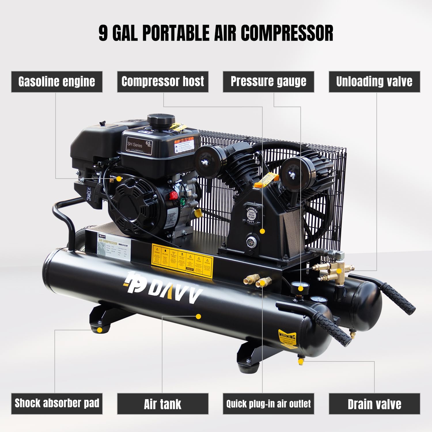 | Model Name | HPDAVV 6.5HP Gas Powered Air Compressor with Wheels 9 Gallon Air Tank 12 CFM Wheelbarrow Gasoline Powered Piston Air Compressor Max.125PSI for Workshop, Machinery, Construction Sites |