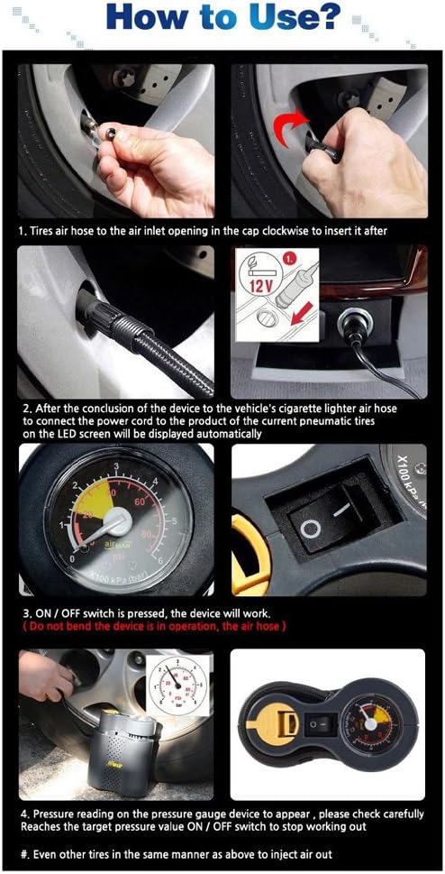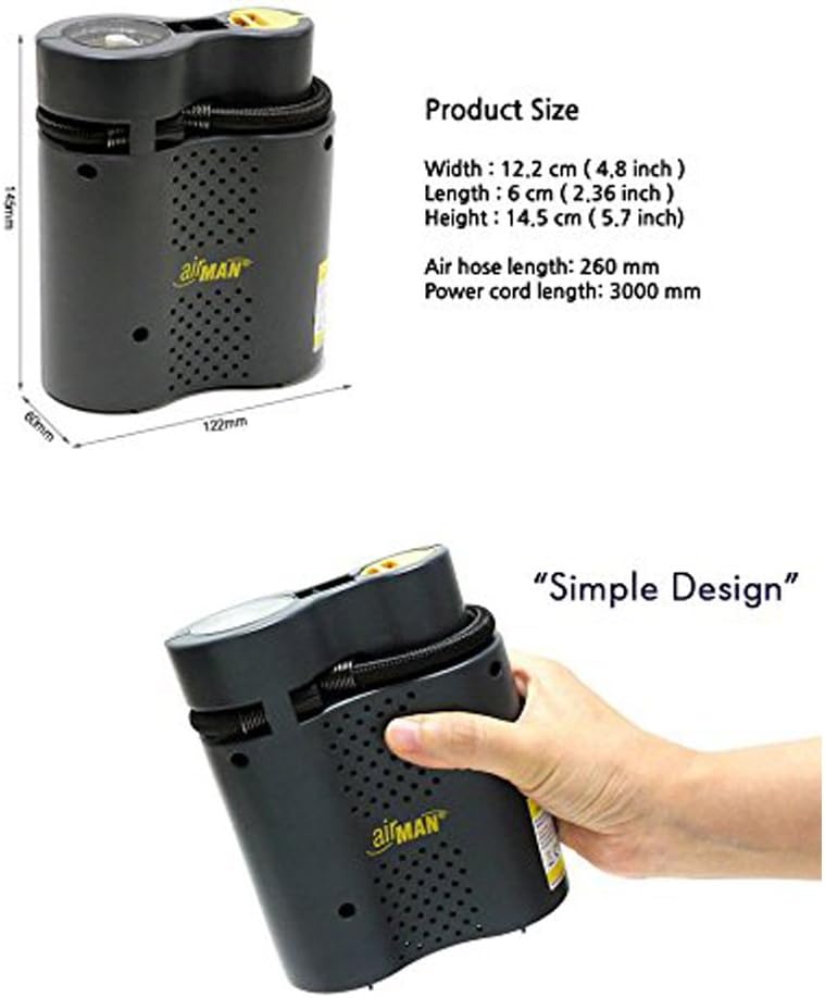 Product Specifications Product name : AUTOCOS Airman Tour Quantity : 1 P Materials : Metal, Plastic, Rubber, Others Condition : 100% brand new with package Size : 12.2 x 6 x 14.5 cm (4.8 x 2.36 x 5.7 inch) Color : Black Product Features Always maintain proper air pressure, no matter where you are, with the AirMan Compact Air pump This pump features a plug that will fit in any socket and is easily convertible to also fit a standard cigarette lighter size power socket The pump has a built-in pressure gauge and on/off switch The pump is reliable and easily capable of fully inflating tires to operating pressure There is also a convenient storage compartment for storage of the included inflation adapters