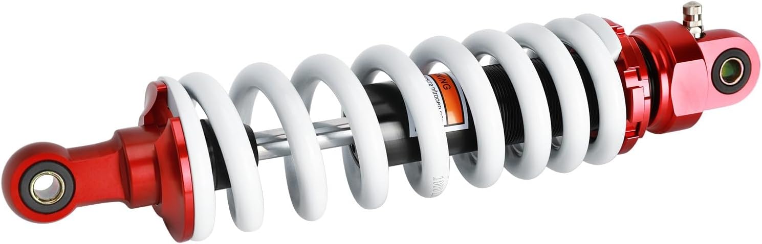 Adjustable Rear suspension damper, suitable for quads/some pit bikes buggies. It serves for many other bikes with similar dimensions and poundage.High quality precision parts with strength and durability. With fine workmanship and glossy surface, premium metal is firm and stable.Provides smoother and better overall driving management. The lightweight upgrades improve overall performance in processing and durability.Easy installation and does not require any sort of modification or drilling. Eye to Eye Length 310mm /12.2inSpring Thickness 12mm/0.47inSpring Diameter 71mm/2.80inDiameter of Mounting Hole 10mm/0.40in(Lbs / in) 1200lbsMaterial Aluminum Alloy