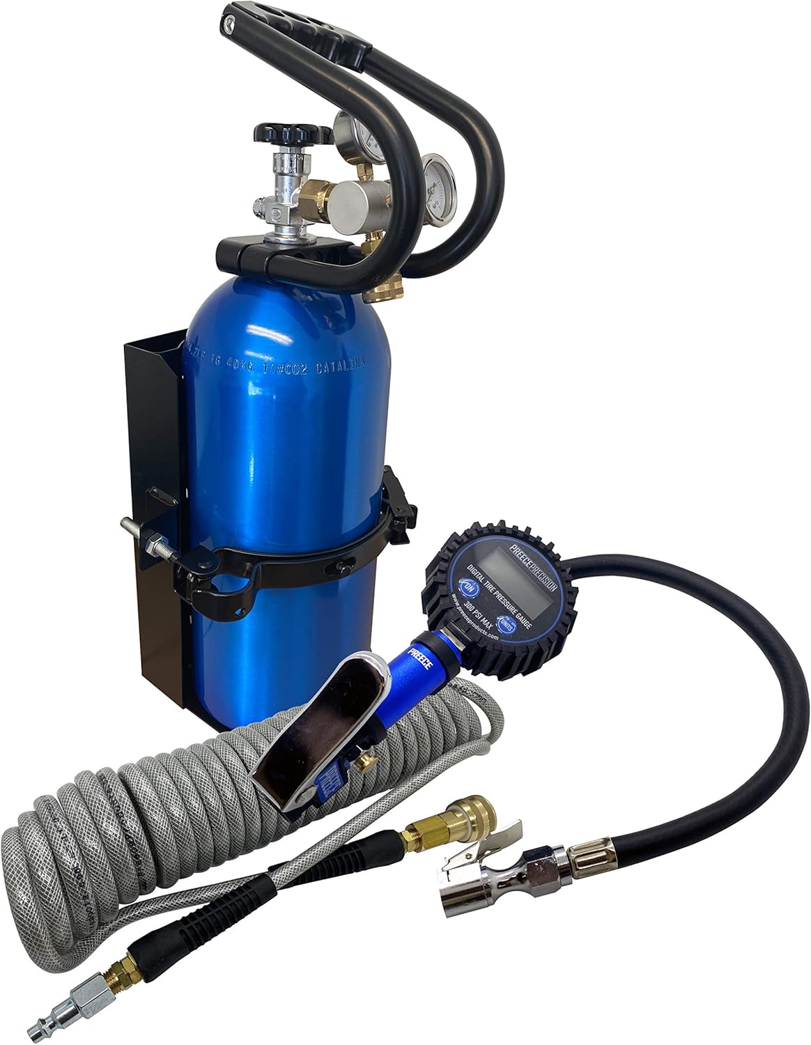 The SOURCE Offroad Co2 by PREECE PRECISION - New Aluminum 10 lb Carbon Dioxide Cylinder and High Flow, non freezing rapid flow 250 PSI Co2 Regulator designed for inflating large off road tires. Co2 cylinder comes with a factory High Gloss CANDY BLUE Powder Coating and unique tubular protective aluminum handle to protect the valve and regulator. Also included - Black powder coated vehicle mounting bracket, 300PSI Digital Tire Inflator and 20' coil hose assembly! Everything is NEW and ready to go to the trail!