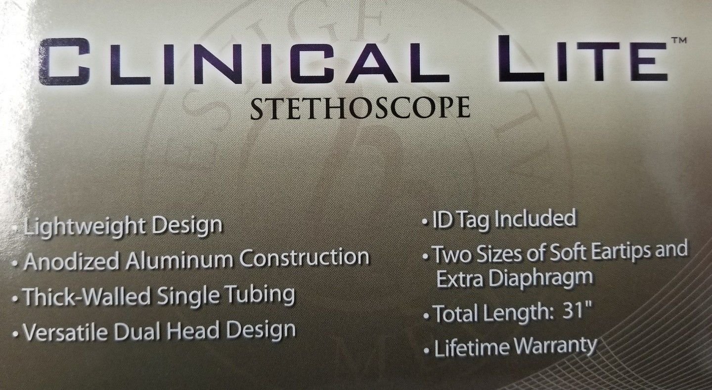 Clinical Lite Stethoscope Soft Silicone Thick Walled PVC AluminumAccessories Included: Two sizes of soft eartips, replacement diaphragm, ID Tag Overall Length: Appx. 31"* Weight: Appx. 3.9 oz* Warranty: Lifetime with Free Lifetime Replacement Parts Ideal For: General Practitioners, Nurses, Nursing Students, Medical Students, EMTs *Due to the handmade craftsmanship and material attributes, actual specifications may vary.Download Product Manual Classic dual head stethoscope made from anodized aluminum for extreme lightweight Fiberglass diaphragm side detects S1 and S2 heart sounds as well as Korotkoff sounds Bell side is optimally designed for assessing S3 and S4 heart sounds Incorporates a snap-on diaphragm retaining ring and a non-chill bell ring which contributes to the ease of use and maintenance, while enhancing patient comfort