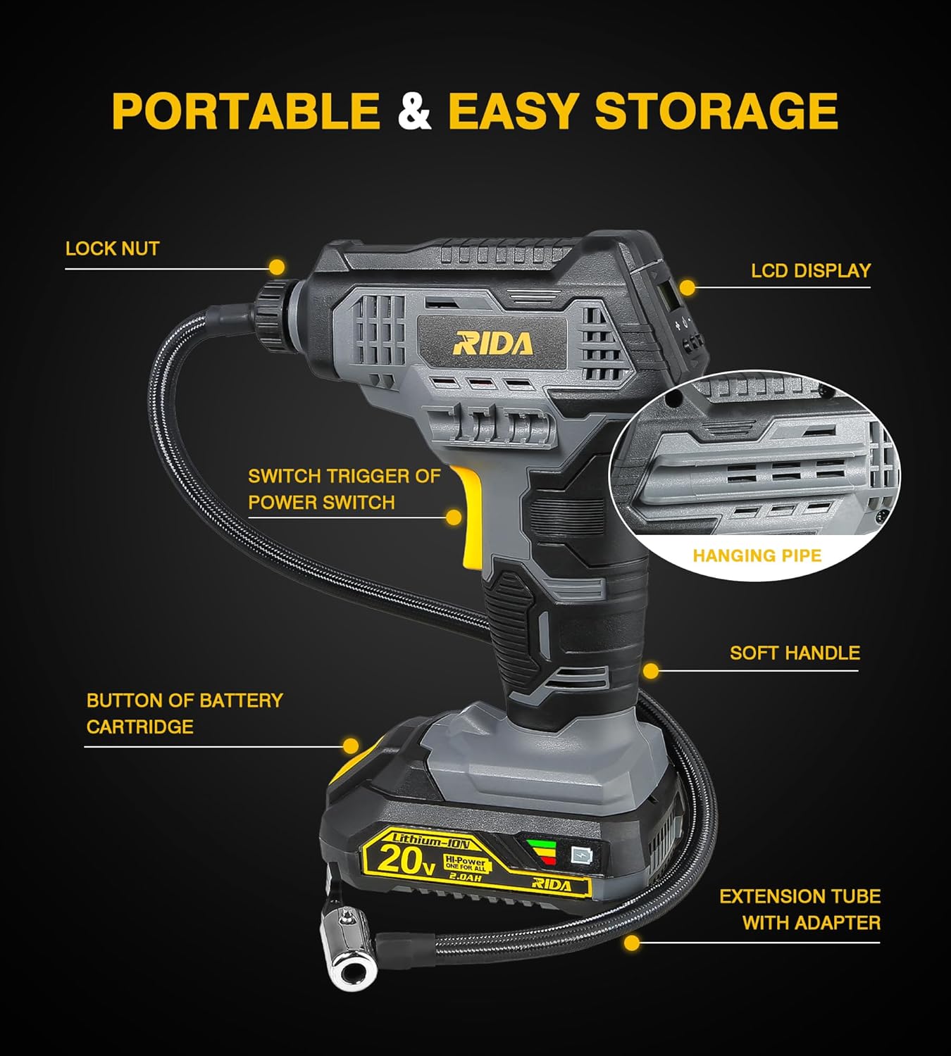 | Included Components | 1 * 50cm Compressor hose with tire valve (quick change), 1 * 9.5mm Presta valve adapter, 1 * 10mm Presta valve adapter, 1 * Carry bag, 1 * User manual,, 1 * Cordless Tire Inflator,1 * 2.0Ah Lithium-ion Battery,1 * Fast Charger, 1 * Sport ball needle, 2 * Tapered adapter, 1 x Beveled adapter |