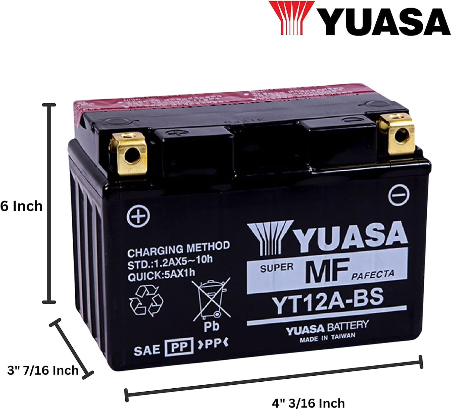 Yuasa AGM batteries are Maintenance Free, with no need to add water, but periodic charging required when not in use. Advanced lead-calcium technology – holds its specific gravity more than 3 times longer than conventional lead antimony batteries. Absorbed Glass Mat (AGM) separators absorb electrolyte making the battery nonspillable, the valve regulated design eliminates water loss and the need for refilling. Bottle Supplied (BS) – dry AGM batteries are shipped with the electrolyte stored in a plastic container and the battery is filled with electrolyte from the container by the end user when it’s ready to be activated. Size/Weight - Length: 6 in (150 mm), Width: 3 7/16 in (87 mm), Height: 4 3/16 in (105 mm), Weight with Acid (lbs.): 7.7; Specs - Capacity Ah: 10 @ 10HR, Regular Charge Current (Amp): 1, C.C.A. @ 0 °F (-18 °C): 175