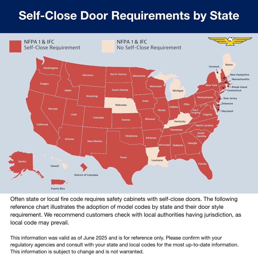 Keep your facility safe, compliant, and efficient with a durable flammable storage cabinet engineered for demanding work environments. Ideal for storing fuels, solvents, and other hazardous materials, this cabinet is a reliable choice for workplaces that prioritize safety.Constructed from rugged 18-gauge steel and made in the USA, the fuel storage cabinet features double-wall construction with a 1.5-inch insulating air gap to enhance fire resistance. A chemical-resistant, lead-free powder-coated finish adds durability in harsh industrial settings.Manual-close doors open a full 180 degrees and include a three-point latching system with a keyed cylinder lock, offering both ease of use and enhanced security. Full-length piano hinges ensure smooth operation and long-term reliability. Self-close models automatically shut and latch when a fusible link activates at 165°F, helping to contain fire without the need for manual intervention.Dual flame-arrester vents promote safe ventilation, while leveling feet and a built-in grounding connector help ensure stability and regulatory compliance. Inside, adjustable galvanized SpillSlope™ shelves direct spills away from contents and into a sump for easy cleanup.Fully FM approved and designed to meet OSHA and NFPA standards, Eagle cabinets are dependable flammable cabinet storage solution that helps keep your team safe and your facility up to code.