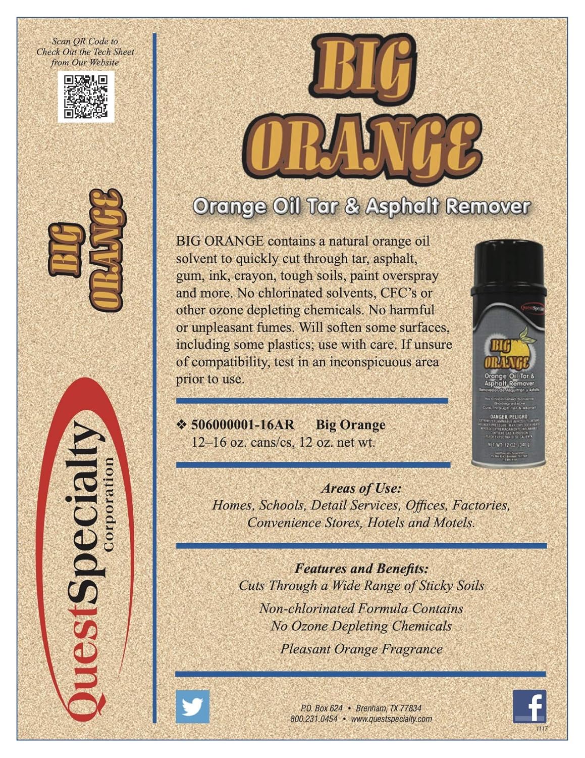 DESCRIPTION BIG ORANGE contains a natural orange oil solvent to quickly cut through tar, asphalt, paint overspray. No chlorinated solvents, CFC’s or other ozone depleting chemicals. No harmful or unpleasant fumes. APPLICATIONS Use to remove tar, asphalt and paint overspray. Areas of use include homes, schools, detail services, offices, factories, convenience stores, hotels and motels. FEATURES & BENEFITS • Cuts through tar and asphalt • Non-chlorinated formula contains no ozone depleting chemicals • Pleasant orange fragrance