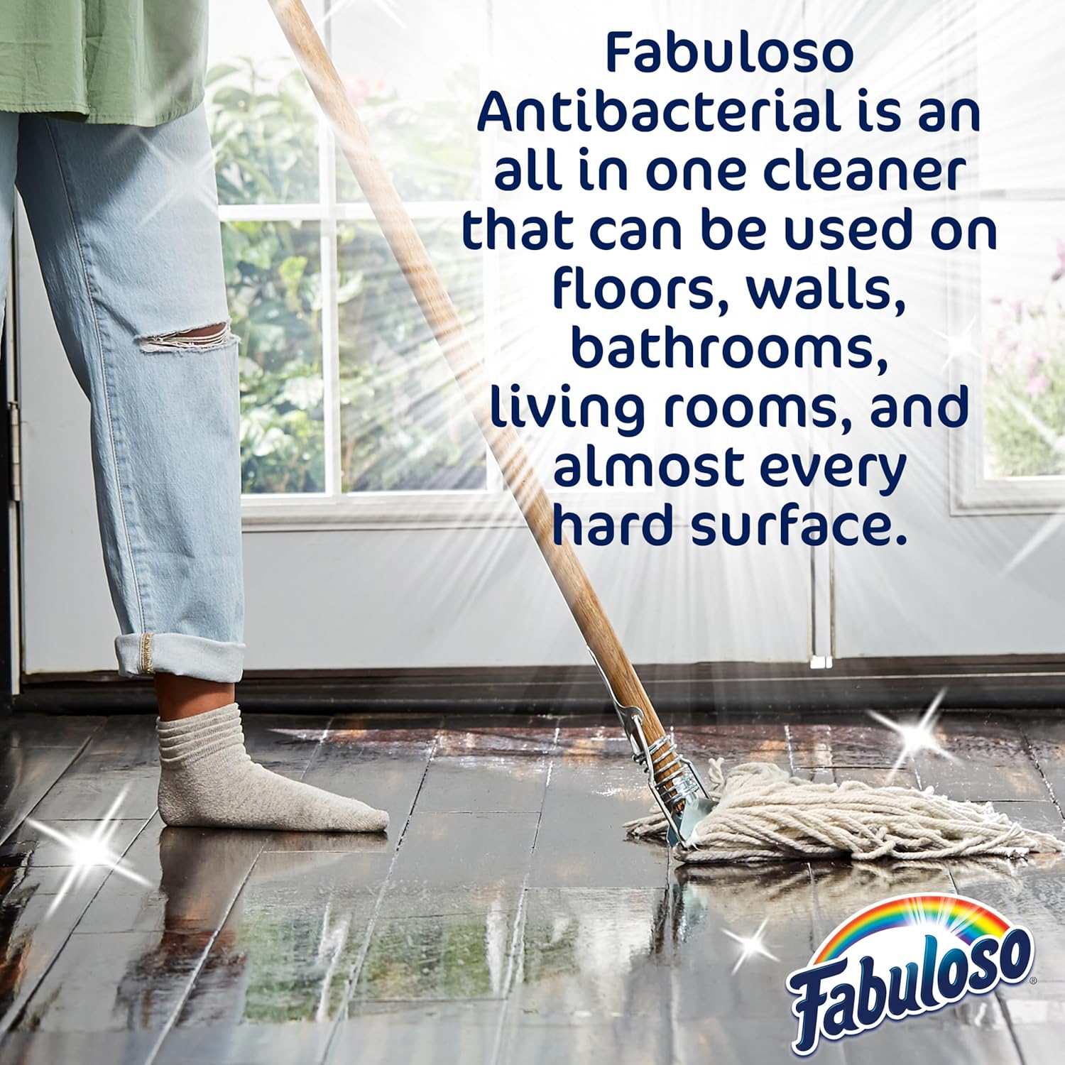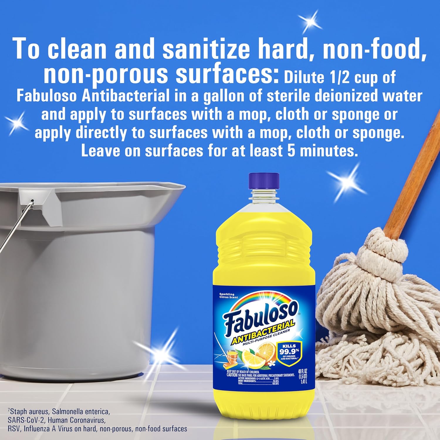 Fabuloso Antibacterial multi-purpose cleaner cuts through grease and removes limescale. It also kills 99.9 percent of viruses and bacteria (7). Fabuloso Antibacterial is an all in one cleaner that can be used on floors, walls, bathrooms, living rooms, and almost every hard surface. For visibly soiled surfaces, preclean surfaces before sanitizing or disinfecting. To clean and sanitize hard, non-food, non-porous surfaces: Dilute 1/2 cup of Fabuloso Antibacterial in a gallon of sterile deionized water and apply to surfaces with a mop, cloth or sponge or apply directly to surfaces with a mop, cloth or sponge. Leave on surfaces for at least 5 minutes. No rinsing required. To clean and disinfect hard, non-food, non-porous surfaces: Dilute 1 part Fabuloso Antibacterial with equal parts tap water and apply to surfaces by sprayer. Spray 6-8 inches from the surface with 4 pumps or until visibly wet. Leave on surfaces for at least 10 minutes. Wipe with a cloth or sponge. Repeat as necessary. And let's not forget the unmistakable fragrance that fills your space with the citrus scent. Experience the power of cleanliness with every wipe! (7) Staph aureus, Salmonella enterica, SARS-CoV-2, Human Coronavirus, RSV, and Influenza A Virus on hard, non-porous, non-food surfaces