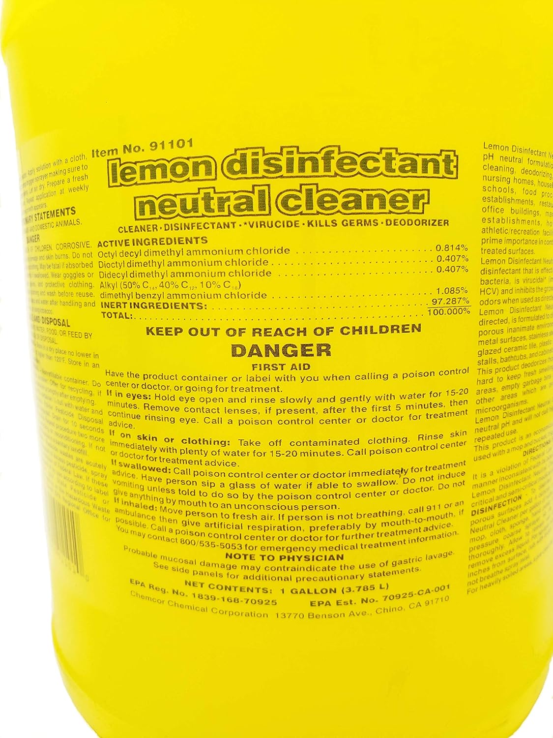 Chemcor Chemical has been serving the Industrial Institutional, Janitorial, Healthcare, and Foodservice Industries for over 40 years. Located in Chino, CA, Chemcor makes their product proudly in the USA! Lemon disinfectant Neutral Cleaner is a phosphate-free pH neutral formulation designed to provide effective cleaning, deodorizing, and disinfection for hospitals, nursing homes, households, homes, private residences, schools, food processing plants, food service establishments, restaurants, transportation terminals, office buildings, manufacturing facilities, lodging establishments, hotels, retail business, and athletic/recreation facilities, where housekeeping is of prime importance in controlling cross-contamination from treated surfaces. Lemon disinfectant Neutral Cleaner is a one-step neutral disinfectant that is effective against a broad spectrum of bacteria, is a viricidal (including HIV-1, HIV-2, HBV and HCV) and inhibits the growth of mold and mildew and their odors when used as directed. Lemon disinfectant Neutral Cleaner, when used as directed is formulated to disinfect the following hard non-porous inanimate environmental surfaces: floors ,walls, metal surfaces, stainless steel surfaces, glazed porcelain, glazed ceramic tile, plastic surfaces, vanity tops, shower stalls, bathtubs, cabinets. This product deodorizes those areas which generally are hard to keep fresh smelling such as garbage storage areas, empty garbage bins and cans, toilet bowls and other areas which are prone to odors caused by microorganisms. Lemon disinfectant Neutral Cleaner is formulated to a neutral pH and will not dull high-gloss floor finished with repeated use. This product is an economical concentrate that can be used with a mop and bucket, trigger sprayers or sponge. 4 ounces per gallon – This concentrated 1 gallon bottle MAKES 32 GALLONS! (when diluted according to 4 ounces/gallon)