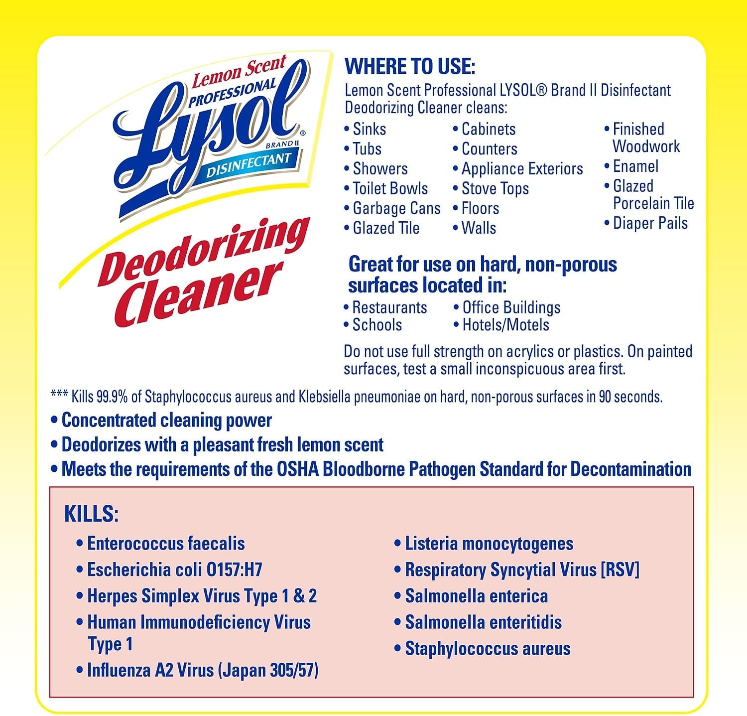This economical, concentrated formula makes up to 64 gallons (1:64) and can be used for a variety of needs to clean, disinfect and deodorize. Use on walls, floors, restroom fixtures and surfaces, garbage cans, cabinets, glazed tile, enamel and glazed porcelain.