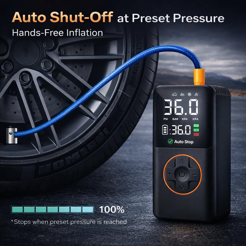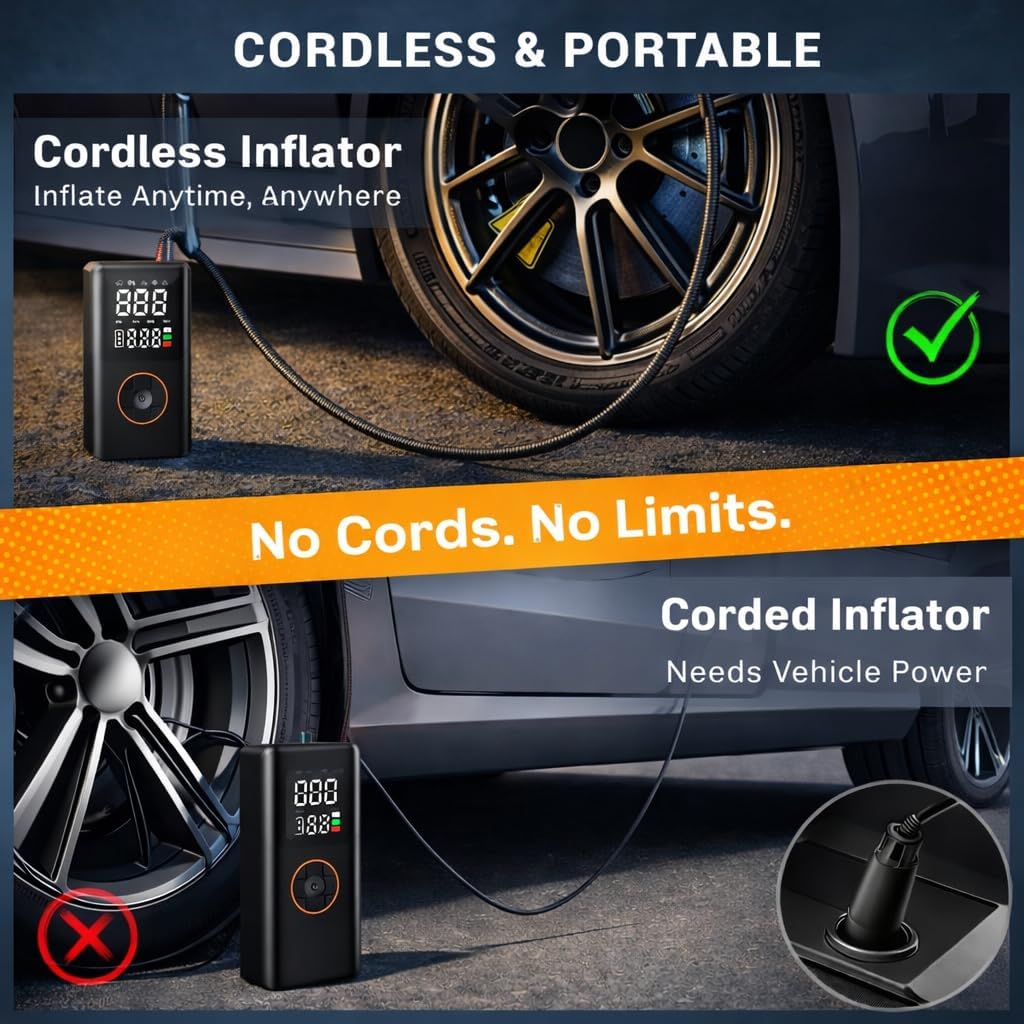 Kooqi Tire Inflator Portable Air Compressor, 150PSI Cordless Electric Bike Pump, Portable Tire Inflator with LCD Pressure Gauge & LED Light, Portable Air Pump for Car, Motorcycle, Bicycle, Balls