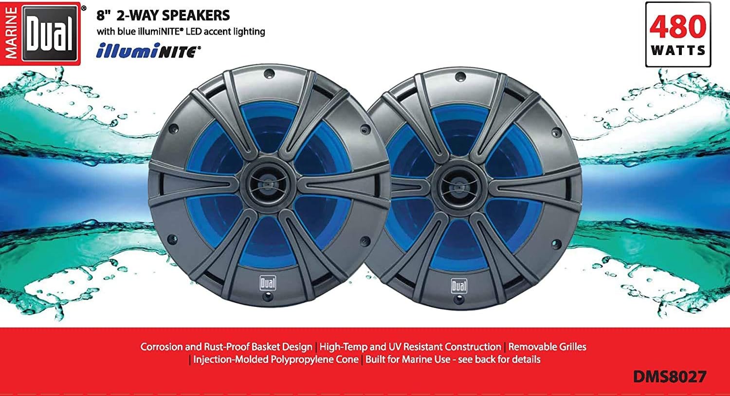 Step up your boating audio. These 8″ speakers are designed to withstand the tough marine environment. Blue illumiNITE LED accent lighting adds visual flair to your on-the-water adventure.