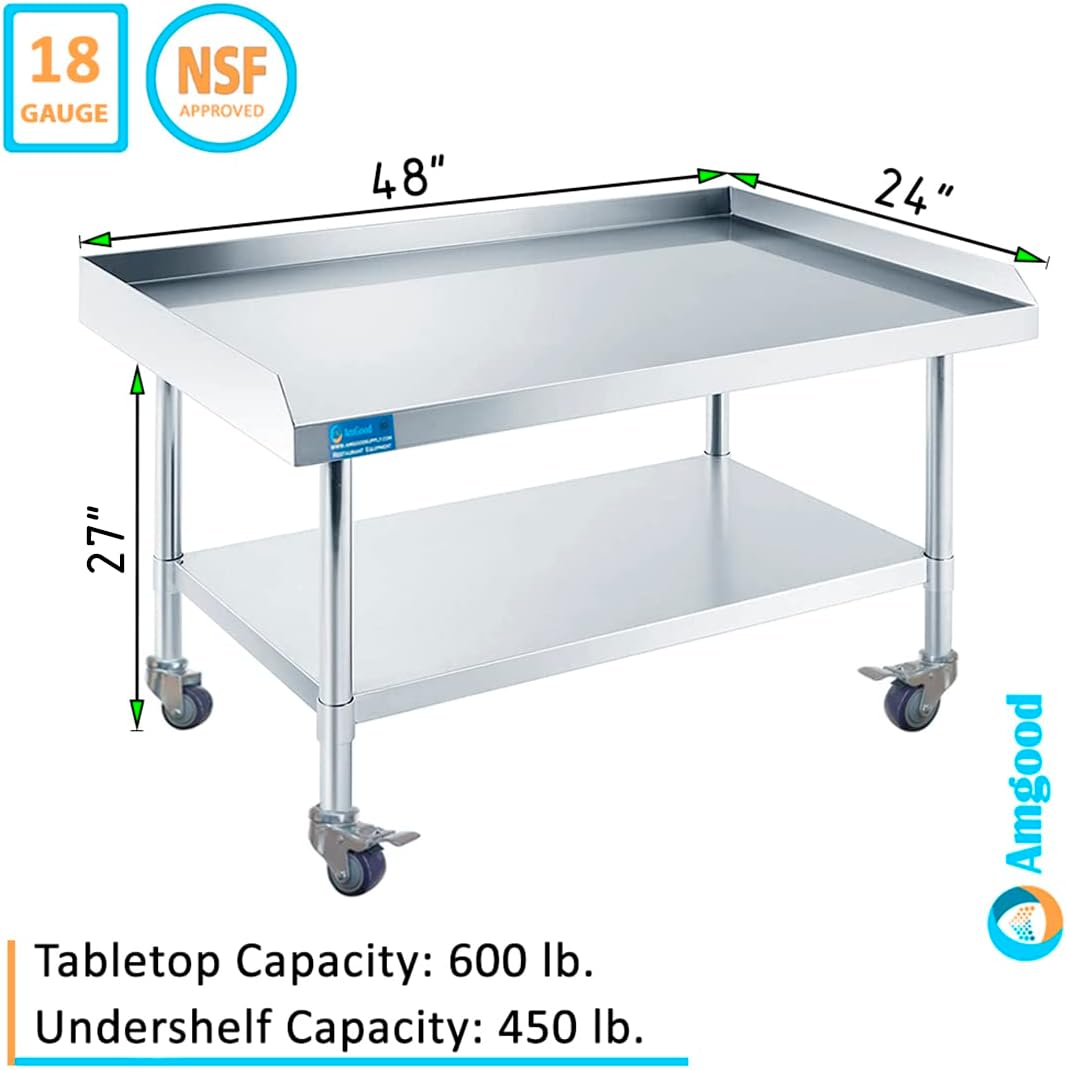 The Express-KitchQuip Stainless Steel Rolling Equipment Stand with Wheels (48" x 24") delivers a strong combination of mobility, workspace, and storage in one durable, commercial-grade unit. Whether you're staging a large mixer, prepping ingredients, or organizing supplies, this mobile stand is built to adapt to high-paced kitchen environments. Its heavy-duty stainless steel frame is paired with four smooth-glide casters (two locking) for flexibility and control. A lower undershelf keeps essential items within reach, while NSF certification ensures it's safe for foodservice use. Perfect for restaurants, bakeries, catering kitchens, and commissary operations.