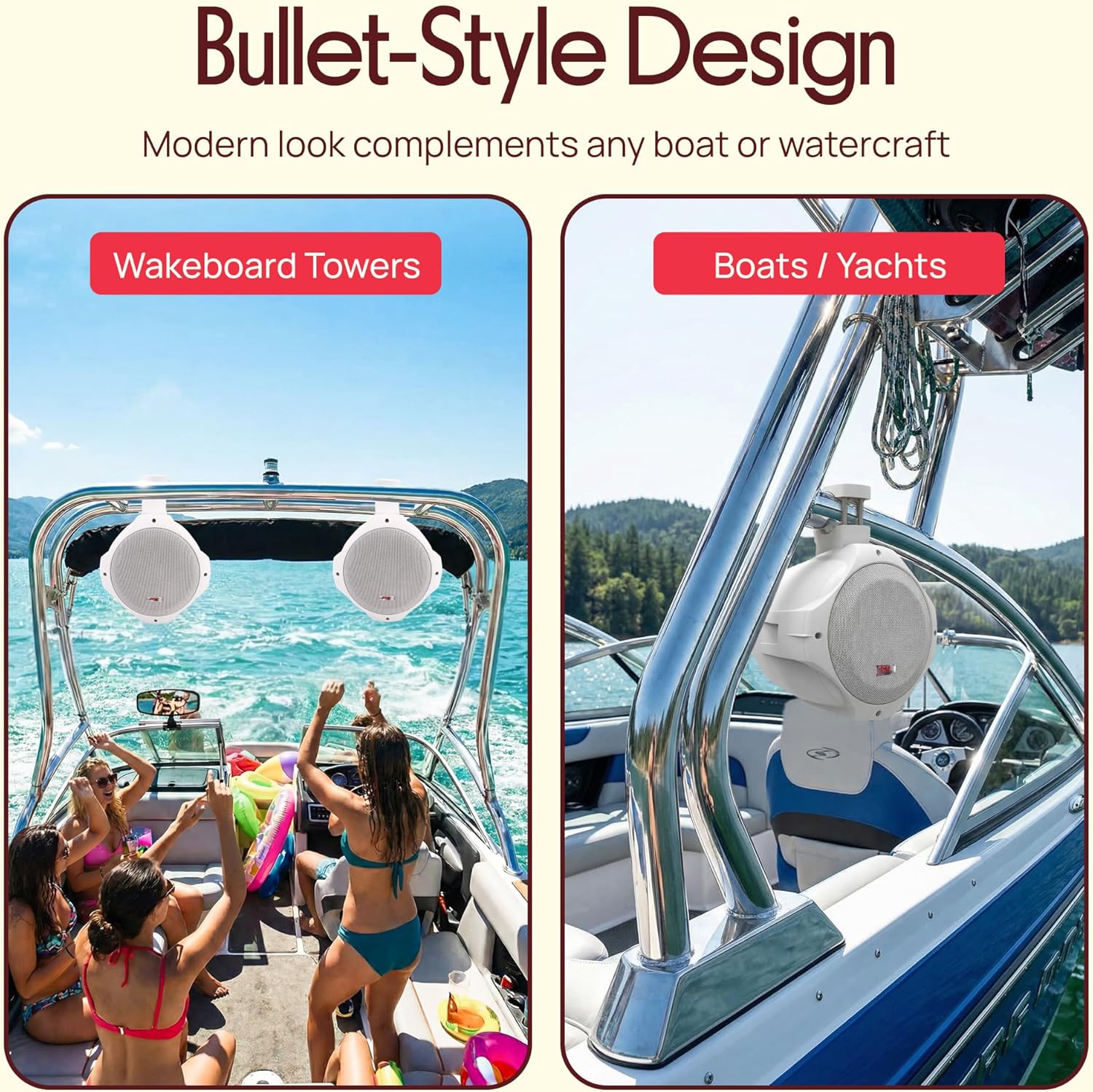 Upgrade your sound experience on the water or outdoors with the Waterproof Marine Wakeboard Tower Speakers. Featuring dual 8” subwoofer speakers and 1” polymer dome tweeters, this 2-way audio system delivers up to 300 watts of peak power with a wide 60Hz–20kHz frequency range. Perfect as boat speakers or outdoor marine speakers, they project high-quality sound for wakesurfing, water sports, or relaxing dockside. Made with IP-44 rated waterproof marine speakers, the heavy-duty ABS housing and corrosion-resistant coating make these durable enough to withstand sun, salt, and splashes. The bullet style speakers feature butyl rubber surrounds and built-in crossover networks, ensuring distortion-free audio performance. Installation is simple with the included universal mounting brackets that fit bars up to 2.0” in diameter. Gold-plated plug terminals add reliability, while the compact 9.9” x 9.6” size makes them easy to mount on most setups. Whether for marine, ATV, or outdoor use, this pair of wakeboard tower speakers combines rugged construction with premium sound, delivering the ultimate blend of du