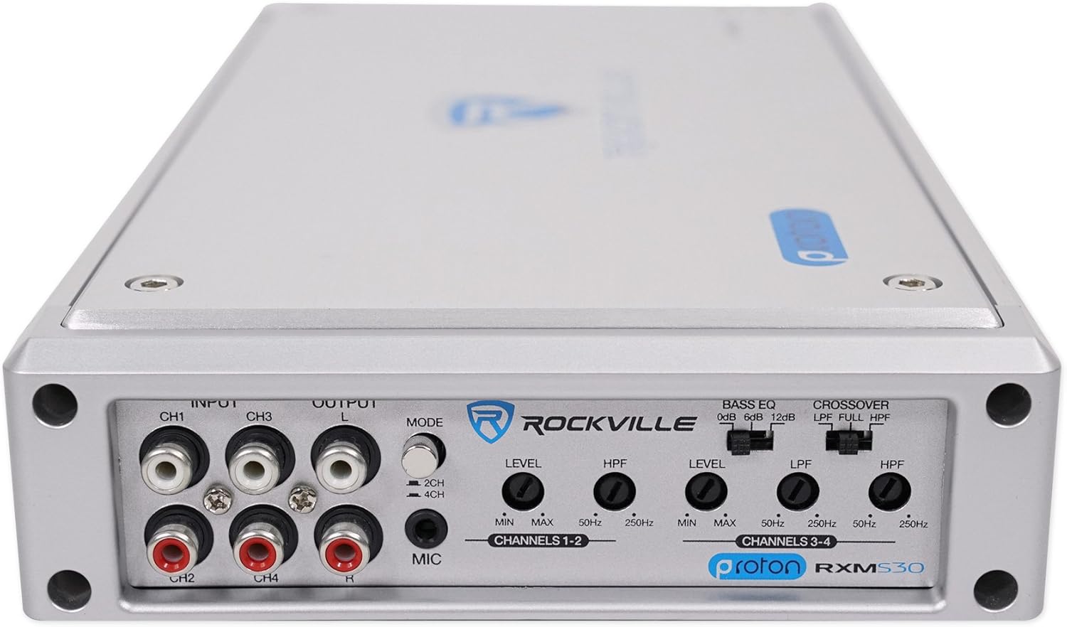 The Rockville RXM-S30 Micro Marine/ATV Amplifier delivers powerful, distortion-free sound with peak output of 2400 watts and Dyno-Certified 4x90W RMS @ 4 ohms or 4x150W @ 2 ohms. Designed for marine and off-road use, this compact 4-channel amplifier features conformal-coated internals and a sealed chassis to resist moisture, rust, and harsh conditions. Its space-saving design (6.7" x 1.98" x 12.28") allows easy installation in tight areas. The RXM-S30 supports flexible audio setups, including bridged, stereo, and mixed-mono configurations, and includes high-end internal components like Elna capacitors, sealed potentiometers, and a double-sided SMD PCB. With a high-speed MOSFET power supply, 15Hz–20kHz frequency response, and >90dB signal-to-noise ratio, it delivers efficient, clean output for marine speakers or ATV sound systems. Whether cruising on the water or hitting the trails, this amp is built to handle it all with precision and power.