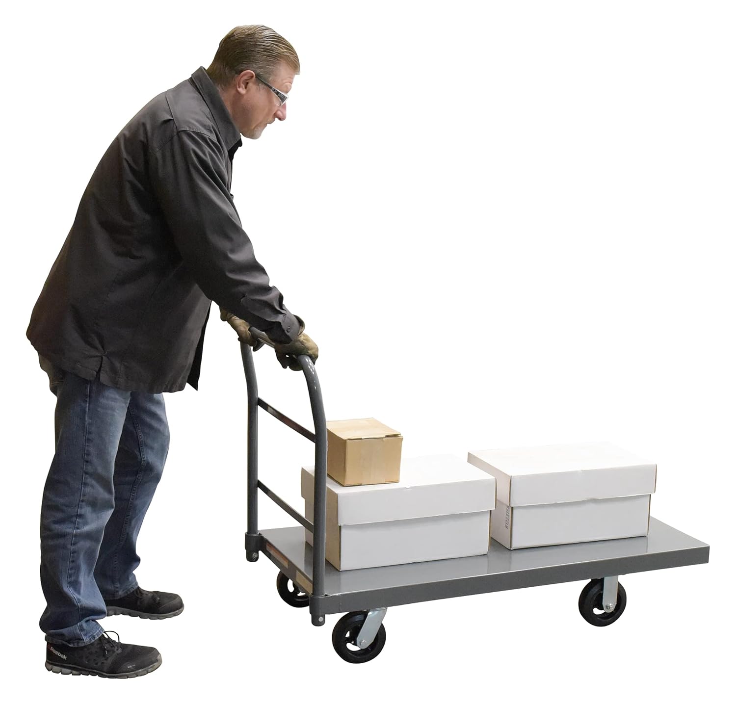 Vestil platform truck with 6-inches diameter by 2-inches width rubber caster. Solid, smooth steel deck is all welded and features structural reinforcement underneath for extra strength. Includes one removable high-polished steel handle and rolls smoothly on two rigid and two swivel casters. 2000-pounds capacity. Measures 48-inches length by 24-inches width by 11.8-inches height.