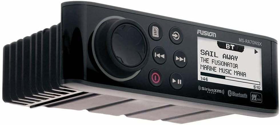 MS-RA70NSX Marine Entertainment System with NMEA 2000 & SiriusXM-Ready™FUSION’s sleekest value-packed marine stereo now with SiriusXM capability, designed to deliver a quality on-water entertainment experience by incorporating some of the latest marine technologies. The MS-RA70NSX is engineered to seamlessly replace any standard DIN sized non-marinized stereo without the need to reconfigure dash space. Clever styling gives the installer the option of either mounting the stereo with a conventional flush finish or integrating it flat into a glass helm, ensuring a high-end finish to the installation.Stream your favorite soundtrack from any compatible device with control* available from the stereo or your connected Apple or Android device via the FUSION-Link Bluetooth app. Simply download the free Apple® or Android™ FUSION-Link remote control app for Bluetooth from the Apple App Store® or Google Play™ store and enjoy localized zone control, source navigation, track selection and the freedom of wireless control.Listen to USB MP3 audio, connect your supported smartphone or even relax to your local AM/FM station; the MS-RA70NSX delivers marine grade entertainment to those who would normally have to resort to installing rust prone car audio stereos. Rest easy, let FUSION entertain you on the water. DAB radio is accessible with the MS-DAB100A module and antenna package (sold separately).The MS-RA70NSX is designed and engineered specifically for the marine environment, with an IPX7 front panel (when mounted correctly) to withstand the environment like none other, perfectly paired with an optically bonded LCD for crystal clear display on the water.The MS-RA70NSX is a FUSION-Link Wired NMEA 2000 certified product and is compatible with a range of the world’s leading Multi-Function Displays for on-screen audio control. When pairing the MS-RA70NSX with a supp