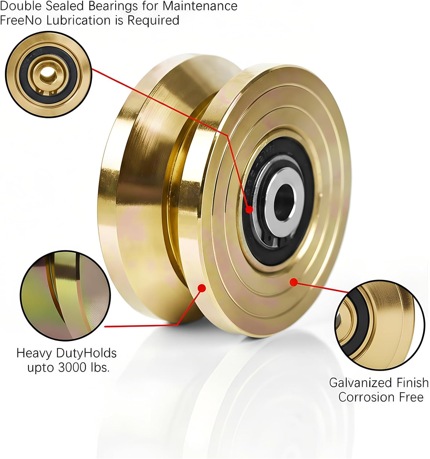 Maintenance-Free: Sturdy steel V-groove wheel with high-temp sealed bearings. No greasing or maintenance needed. Easy Installation: Welded bracket box allows direct attachment to gate frames. Replaces old wheels, extends gate system life for indoor/outdoor use. Size & Load Capacity: 4" diameter, 1 13/16" thick, double-sealed bearings, supports up to 3500 lbs. Ideal for large driveway and security sliding doors with inverted V tracks. Corrosion-Resistant:: Galvanized wheel and powder-coated bracket box protect against rust and corrosion, ensuring smooth operation and reduced maintenance. Versatile Use: Suitable for all sliding gates, rolling doors, towing, gym equipment, and moving heavy loads on V-tracks.