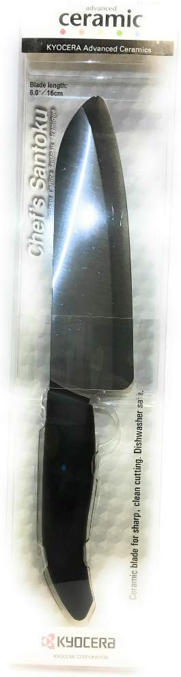 The Revolution Series 5.5" Santoku knife is from Kyoceras most popular line of advanced ceramic knives. Designed with a comfortable, ergonomic handle for precise control. The ceramic blades are made from a proprietary zirconia material produced in Japan and stays razor sharp at least 10 times longer than traditional knives, making them ideal for everyday use. The perfect choice for slicing fruits, vegetables and boneless meats. Not intended for frozen or hard foods. Kyocera advanced ceramic cutlery and kitchen tools are fully warranted to be free of defects in material and craftsmanship.