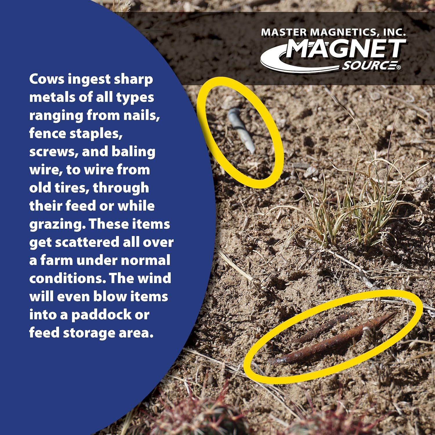 For over 50 years, dairy farmers and veterinarians have trusted the Master Magnetics Ru-Master 5 Cow Magnets to protect livestock. Cow magnets help prevent the harmful effects of cattle ingesting metal objects. While grazing, cows eat everything from grass and dirt to nails, staples, and bits of wire (referred to as tramp iron). Tramp iron tends to lodge in the honeycombed walls of the reticulum, threatening the surrounding vital organs and causing irritation. The cow loses its appetite and decreases milk output (dairy cows) or its ability to gain weight (feeder stock). Cow magnets help prevent this by attracting and holding stray metal from the folds and crevices of the rumen and reticulum.