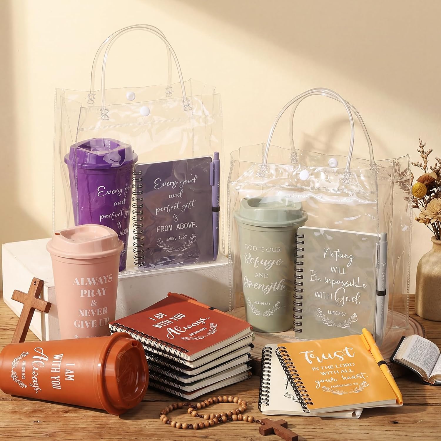 Features: Each product comes in a neat transparent gift bag, making it easy to distribute and present as a gift. Whether you're hosting an event or giving it as a personal present, these bags provide an elegant touch while keeping items visible and organized. Each product in this package is adorned with uplifting Bible verses, providing daily motivation and spiritual encouragement. Whether it's for personal reflection or sharing with others, these items bring a divine message into everyday life. Specifications: Material: Transparent gift bag: plastic Christ plastic coffee cup: plastic Christ's Notebook: paper Christ's pen: plastic and ink Color: multicolor Size: Transparent gift bag: 8.66 x 8.27 x 4.33 inches/ 22 x 21 x 11 cm Christ plastic coffee cup: 16OZ Christ's Notebook: 4.09 x 5.31 inches/ 10.4 x 13.5 cm Package includes: 12 x Transparent gift bag 12 x Christ plastic coffee cup 12 x Christ's Notebook 12 x Christ's pen Notes: Manual measurement, please allow slight errors on size. The color may exist a slight difference due to different screen displays.