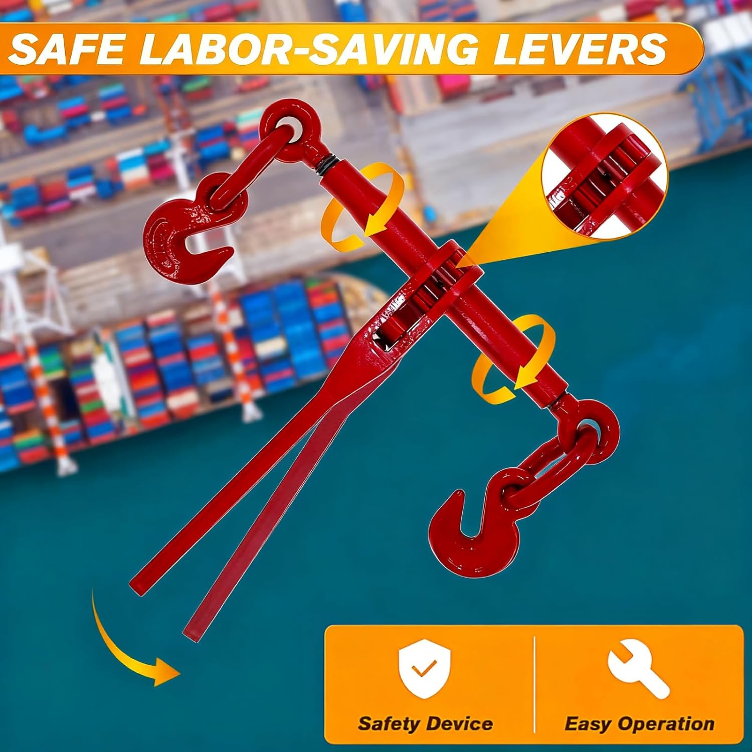 HAQQI Chain and Binder Set – Heavy Duty Cargo Tie Down Kit Built for professionals who demand strength, safety, and reliability. This complete kit includes four ratchet load binders and four 3/8" x 10 ft Grade 80 transport chains with clevis grab hooks, giving you everything you need to secure flatbed and truck cargo with confidence. Trusted Strength Each chain and binder is rated at a Working Load Limit (WLL) of 6,600 lbs and a breaking strength of 26,000 lbs, providing the holding power required for safe transport. Durable, All-Steel Construction Forged steel components with a powder-coated binder resist rust, corrosion, and harsh weather for long-lasting performance. Safe & Efficient Ratcheting A smooth gear-and-pawl mechanism and a 14" handle allow precise tensioning and controlled, safer release during loading and unloading. Wide Applications Ideal for flatbed trailers, trucks, warehouses, construction sites, farms, and docks—use for hauling machinery, towing vehicles, securing logs, and general industrial tie-downs. Package Includes4 × Ratchet load binders (14" handle)4 × 3/8" × 10 ft Grade 80 transport chainsClevis grab hooks pre-attached to each chainNote: Always confirm capacity, inspect hardware before use, and follow local regulations and best practices for cargo securement.