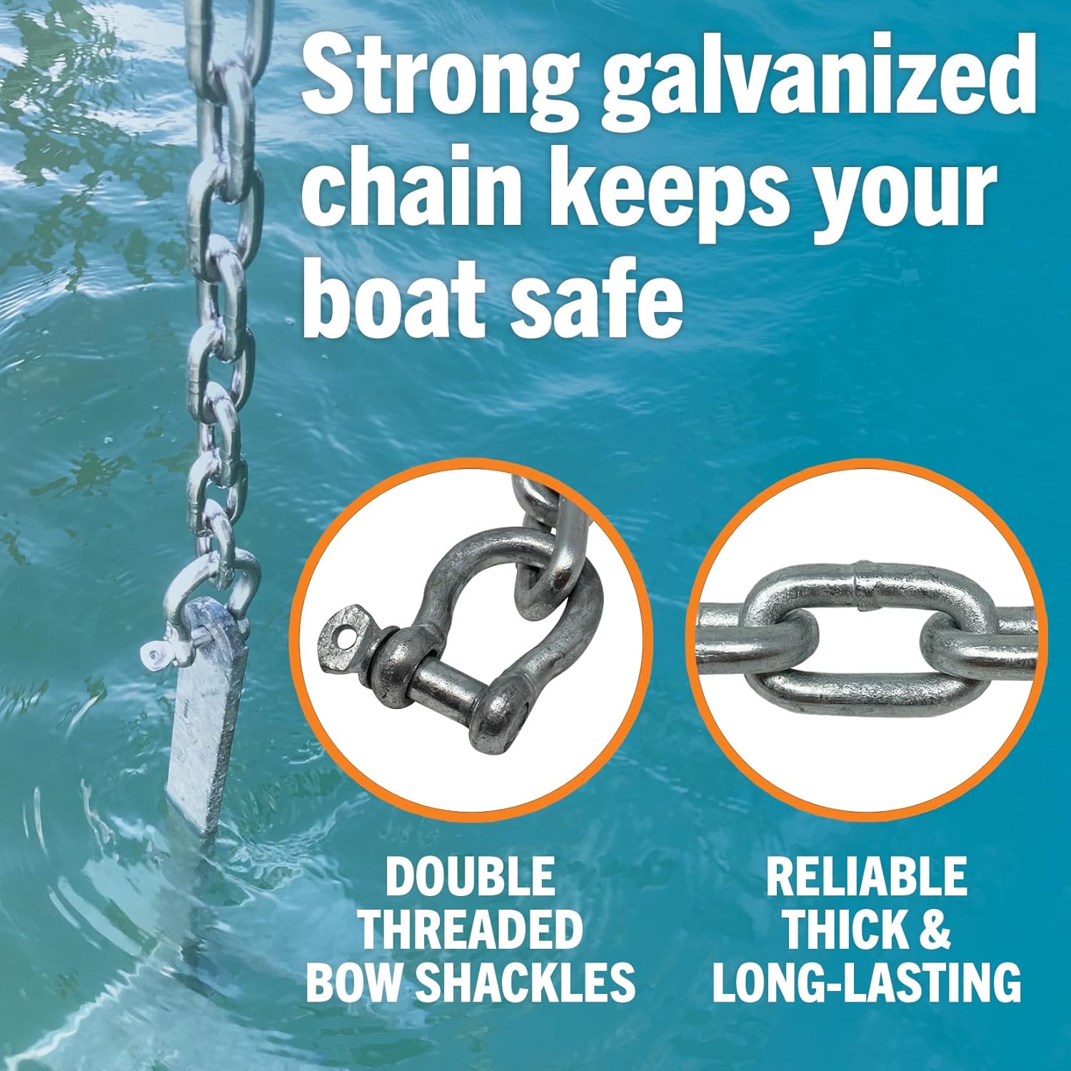 Our Premium Marine Grade Galvanized Anchor chains comes with two separate thick galvanized bow shackles complementing almost all anchor style options and anchor ropes. Upgrade your old steel anchor chain with our premium longer lasting galvanized chain. This chain provides the perfect lead between your anchor and your rope to provide the added protection from coral and underwater rocks. Available in a 3/16 chain, 1/4 anchor chain or 5/16 anchor chain. Coupled with the increased durability, our chain will help properly set your anchor for years to come with corrosion resistance and superior construction. We stand behind the quality of our shackles and chains and other boat anchor accessories like our steel chain accessories. We are a family-owned American business committed to making premium quality products.